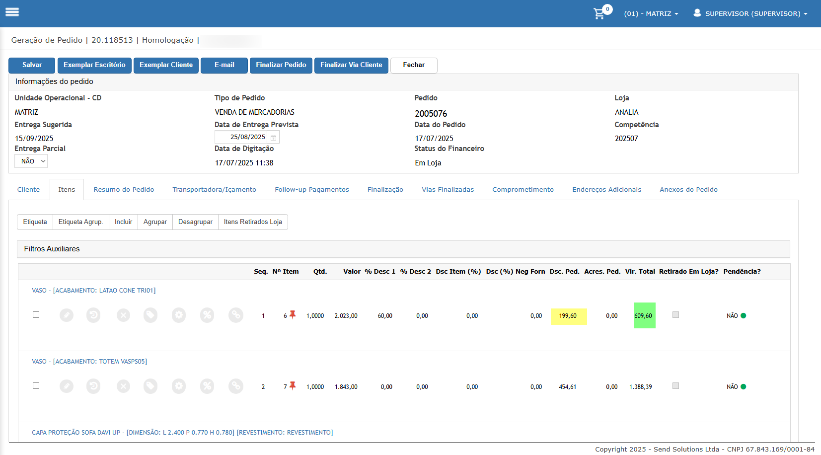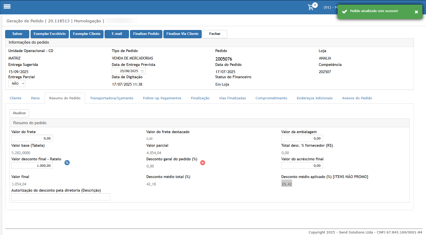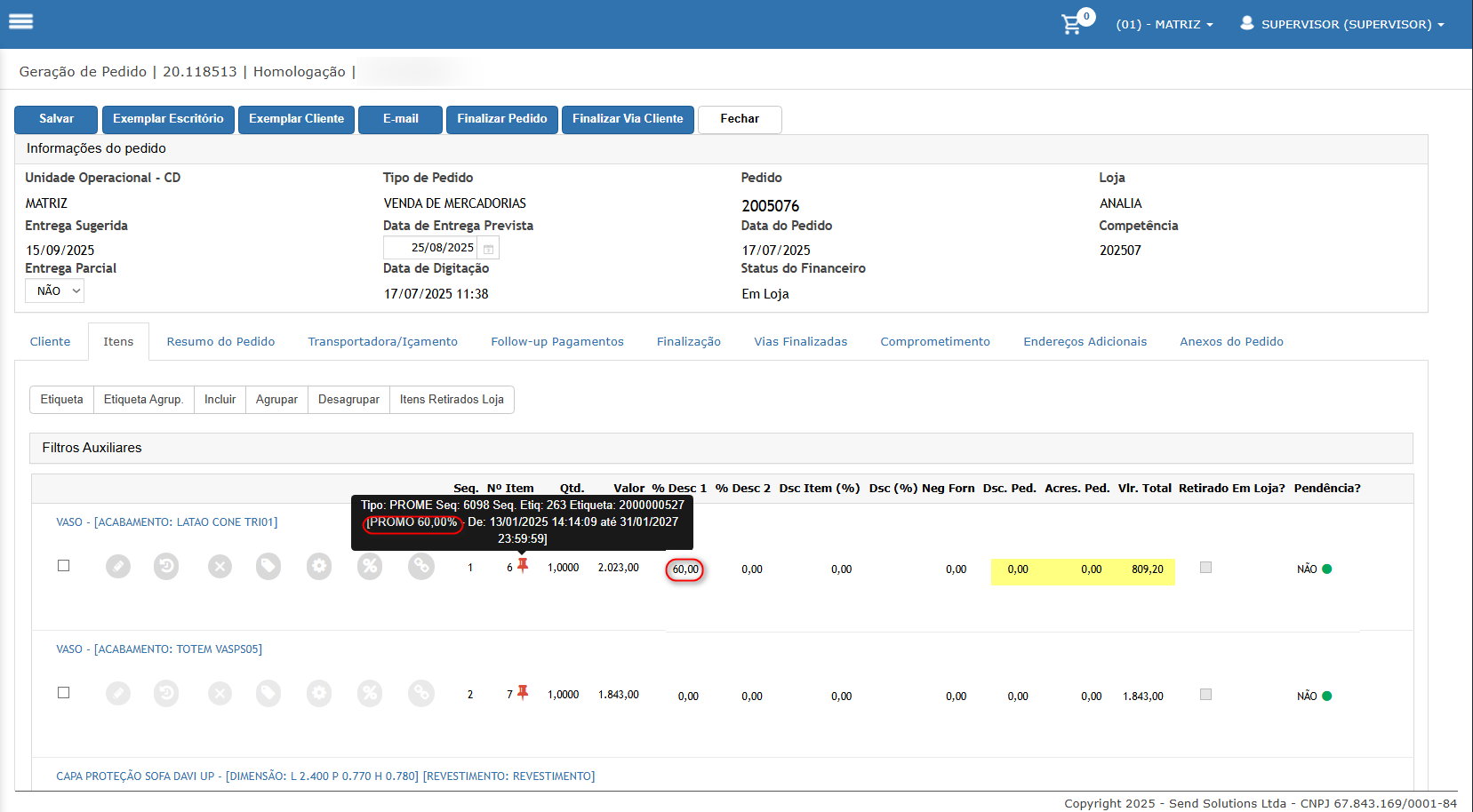 Neste cenário iremos adicionar itens de desconto promo e verificar que o desconto será considerado no rateio.