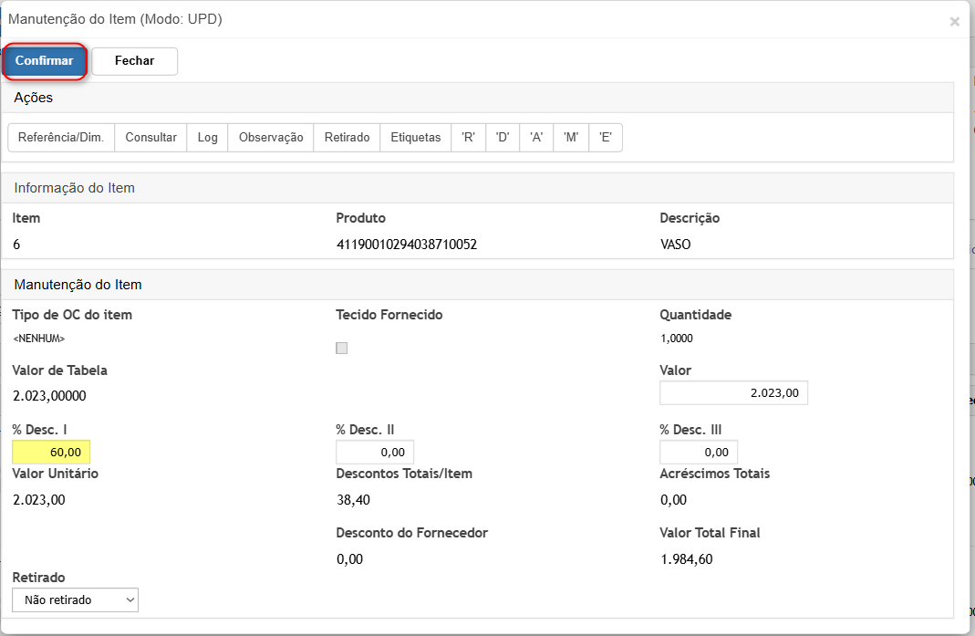 - Editar o item informar o percentual de desconto;
