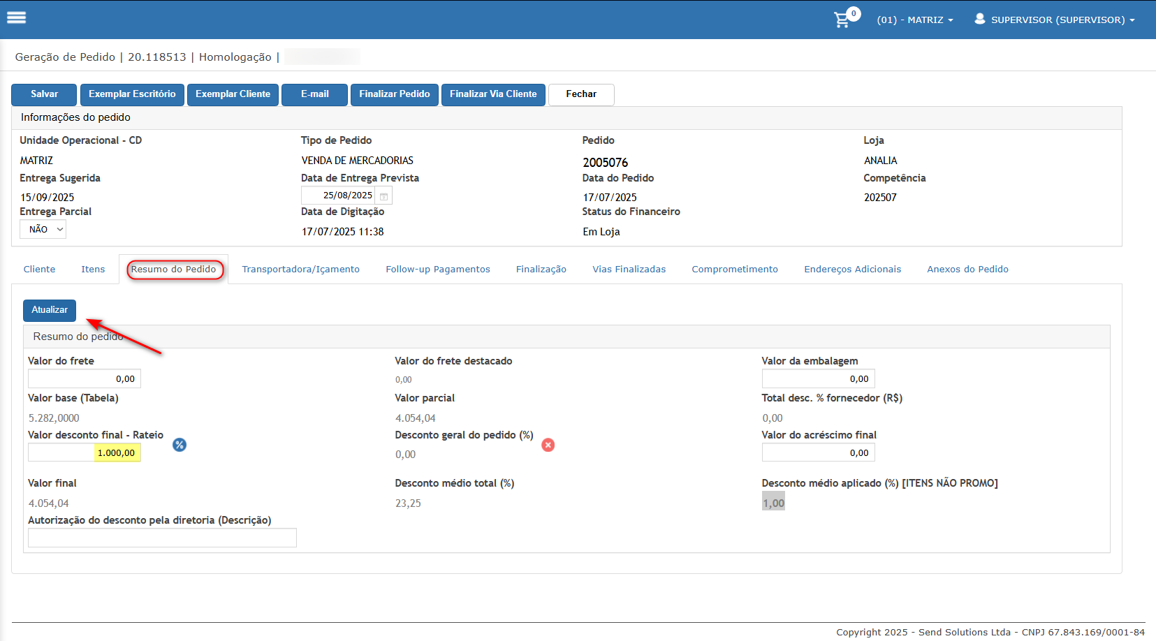 - Esta solicitação tem por objetivo ajustar a rotina que realiza o rateio do desconto nos itens do pedido, para que também considere os itens "PROMO" do pedido.