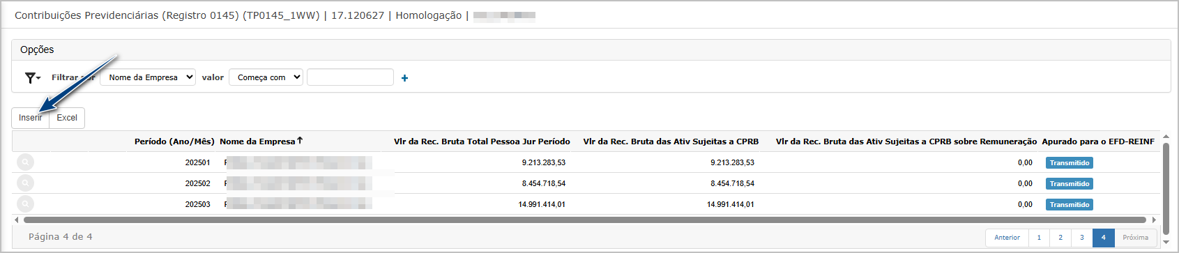 Incluir um novo registro com dados válidos (período, empresa, base de cálculo e valores).