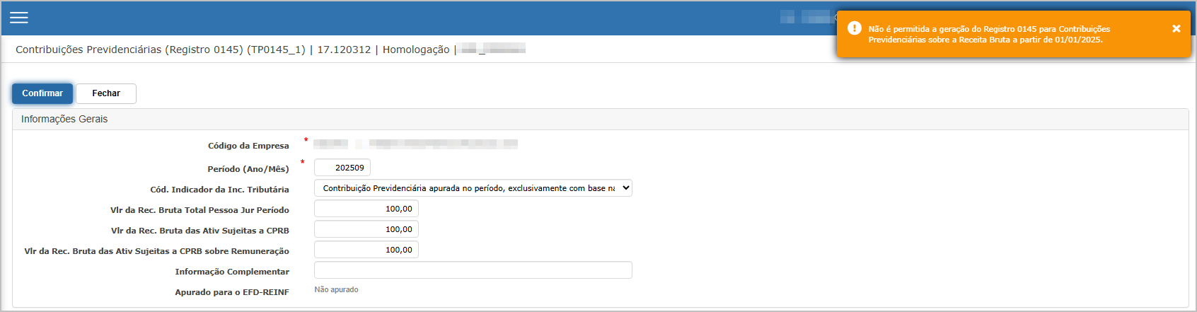 - A interface “Lançamento R-2060 – CPRB” permita a inclusão dos registros, independentemente da funcionalidade "BLOQUEIA REG. 0145 DO SPED CONTRIBUIÇÕES A PARTIR DE JANEIRO 2025", estar ativada ou desativada.