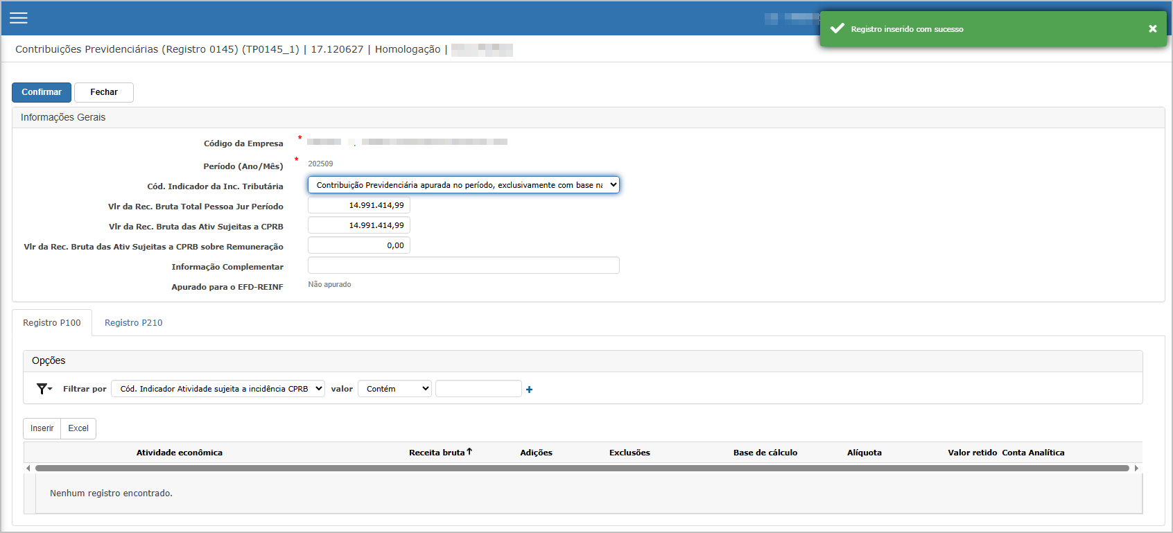 O sistema exibirá mensagem de sucesso e na parte inferior serão exibidas as abas Registro P100 e Registro P210, preencha conforme a necessidade e na sequência clique em confirmar para gravar os dados.