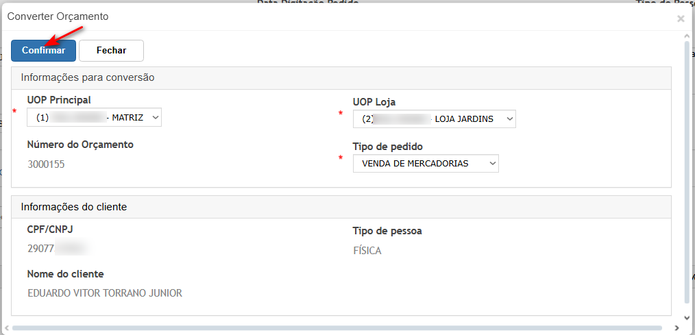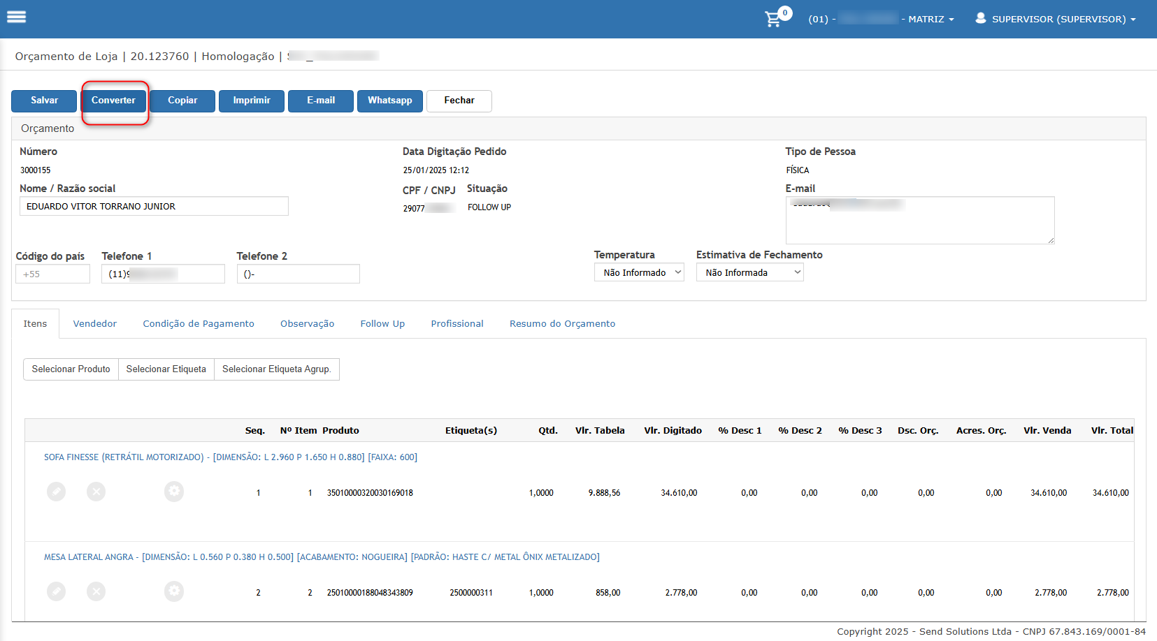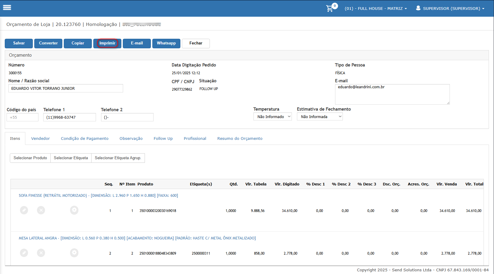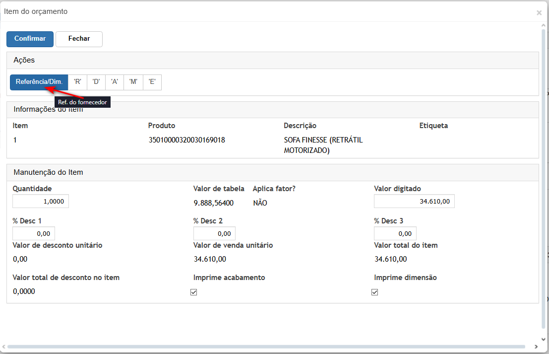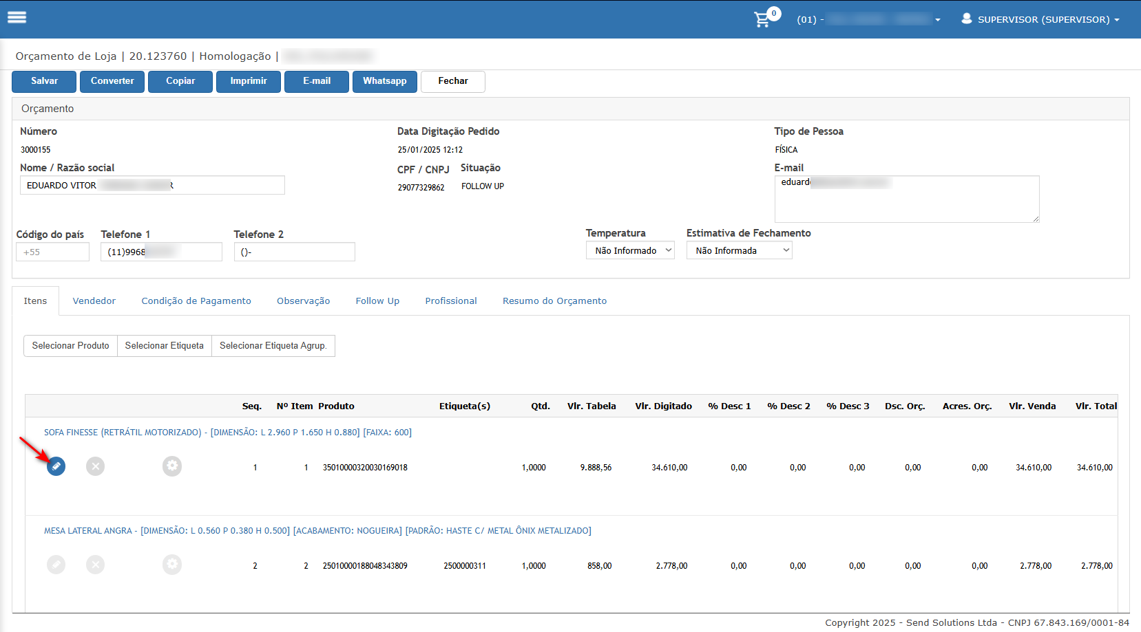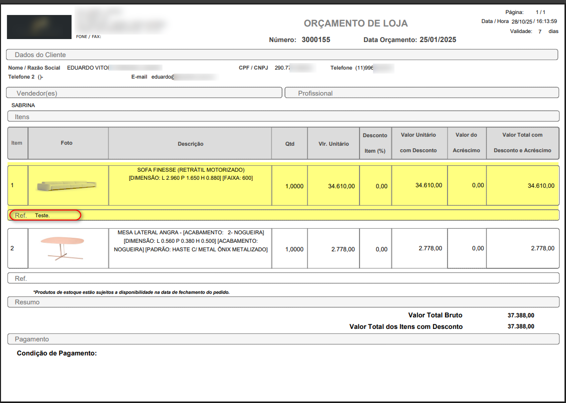 - Após apertar a nova opção, será possível acessar o campo que será refletido na impressão e pedido caso o orçamento seja convertido;