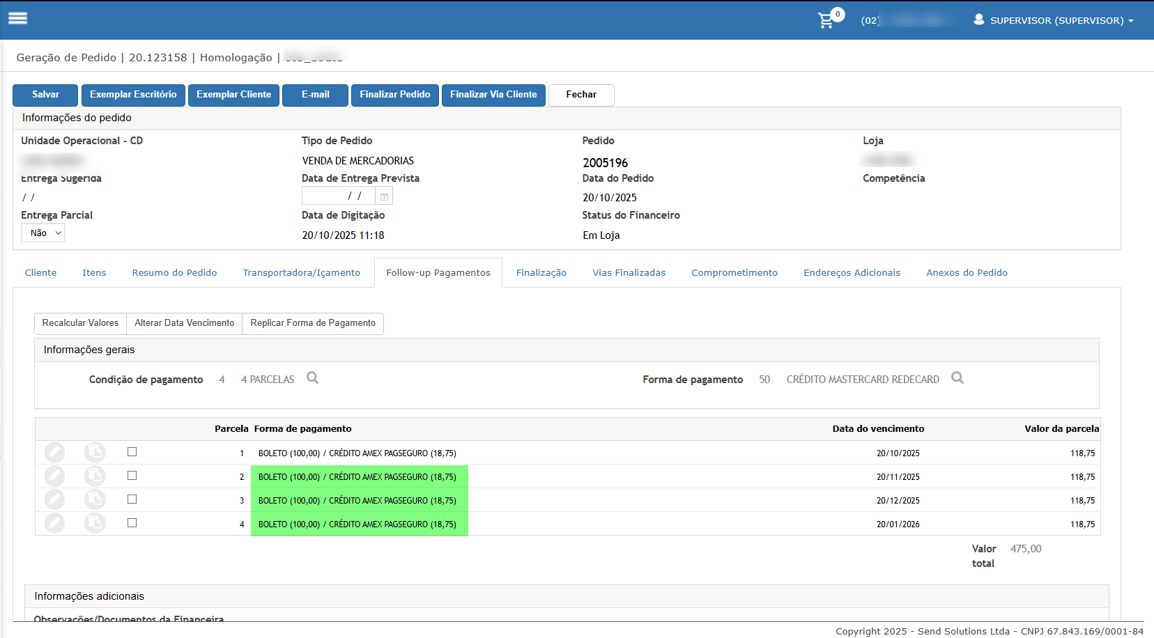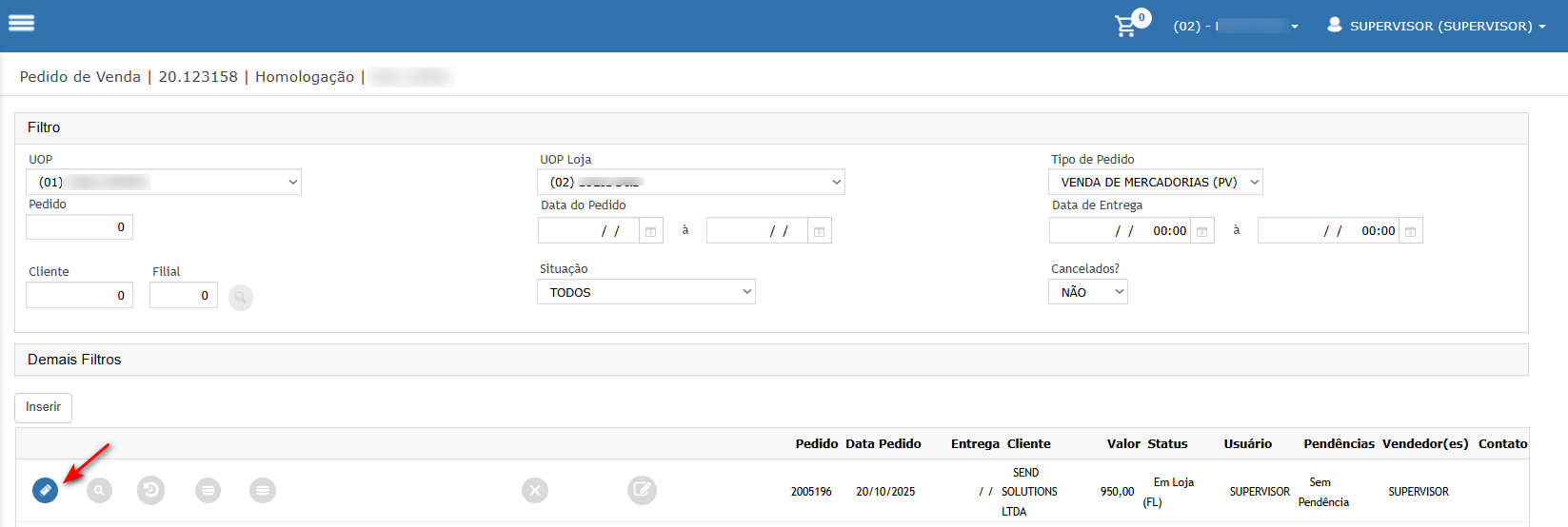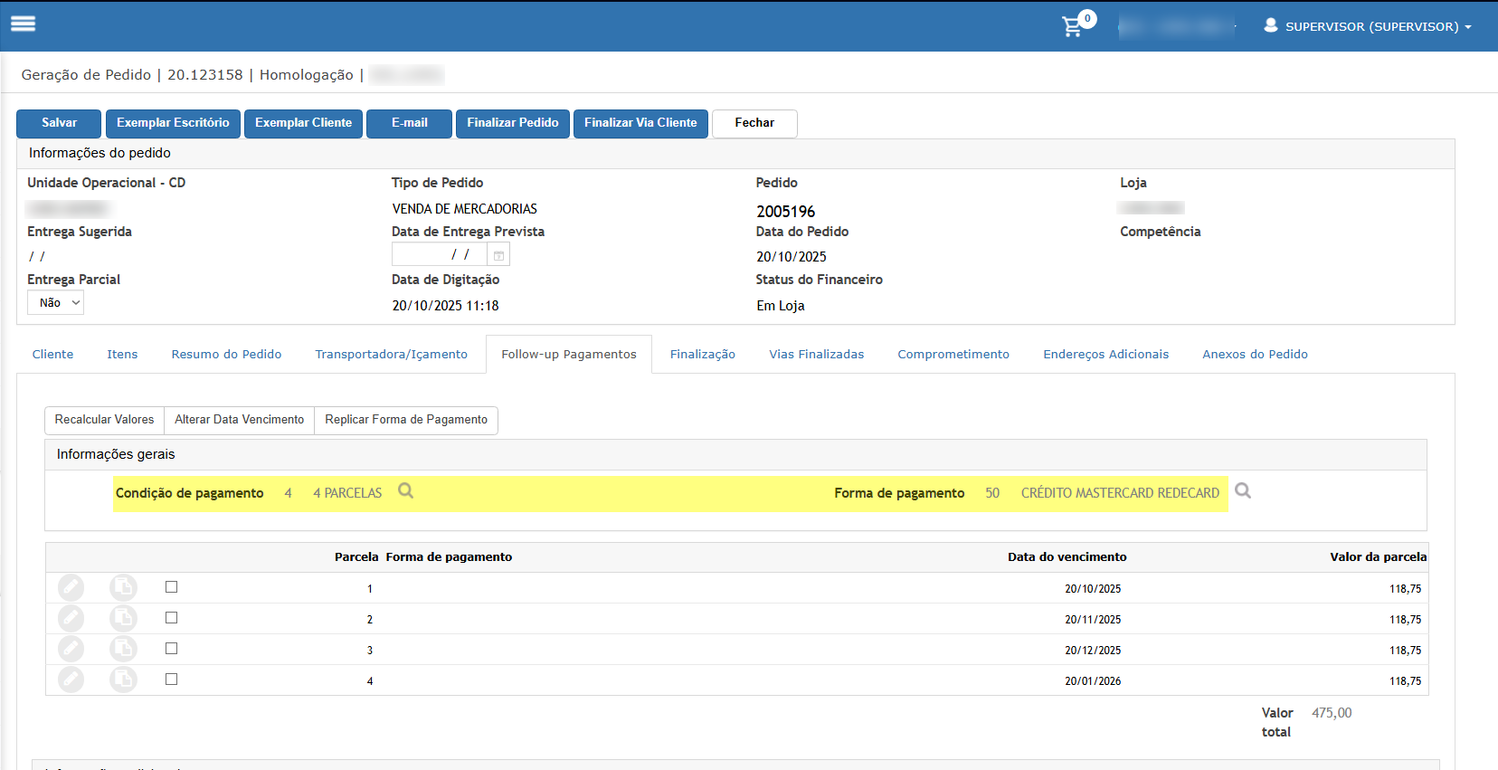 Neste cenário iremos dar manutenção em um pedido na forma de pagamento e verificar que funcionará normalmente.