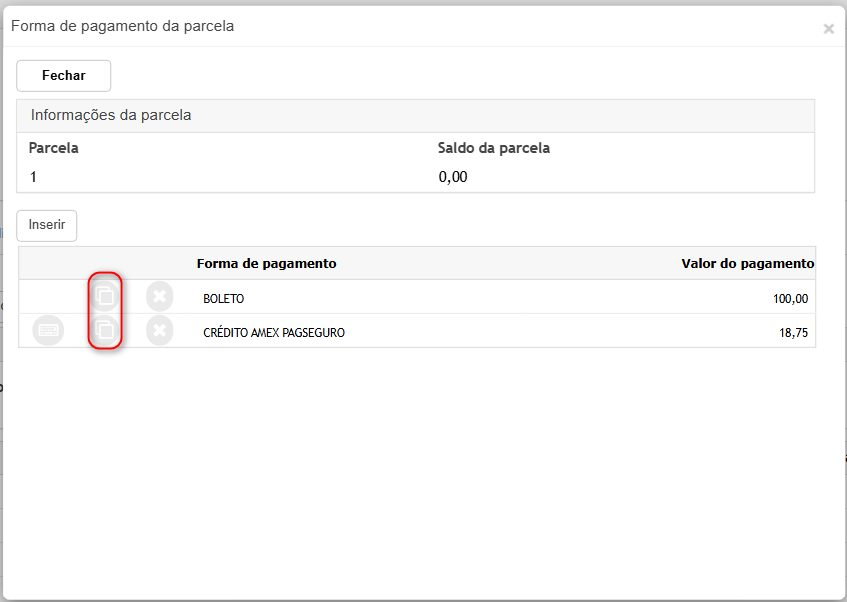 - Editar as parcelas e informar mais de uma forma de pagamento e replicar ambas;