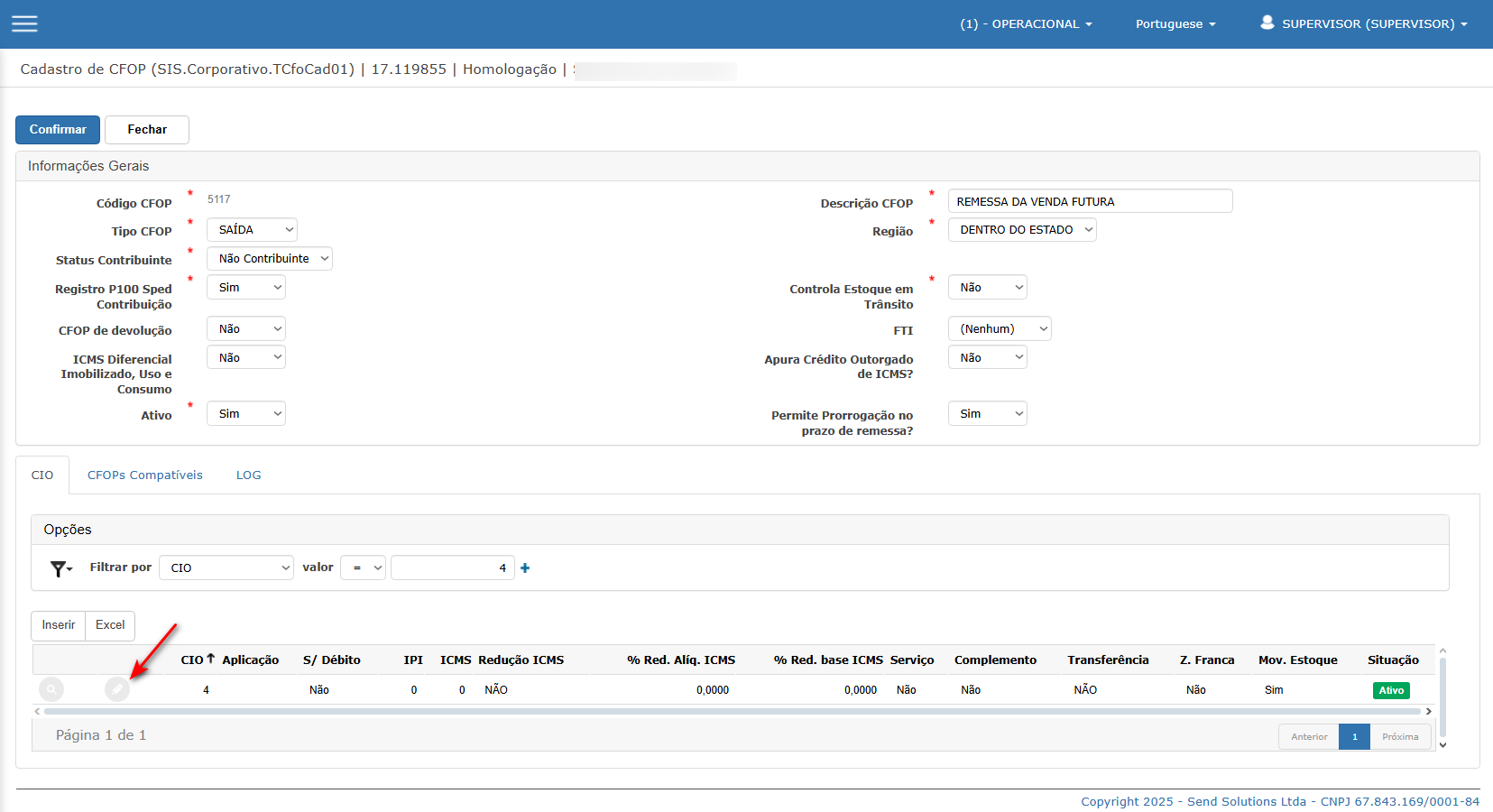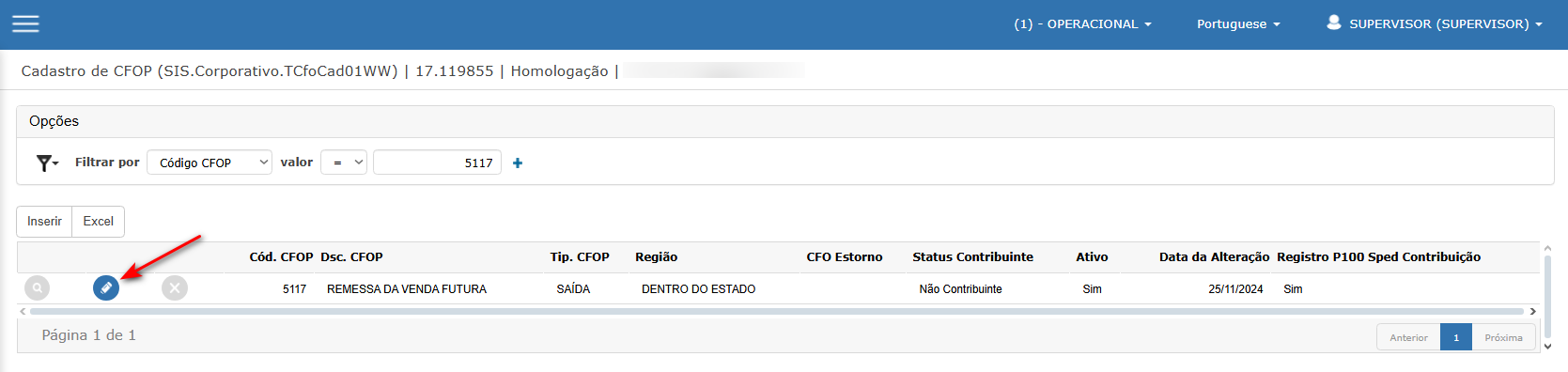 - filtrar uma CFOP, no exemplo iremos editar a CFOP abaixo;