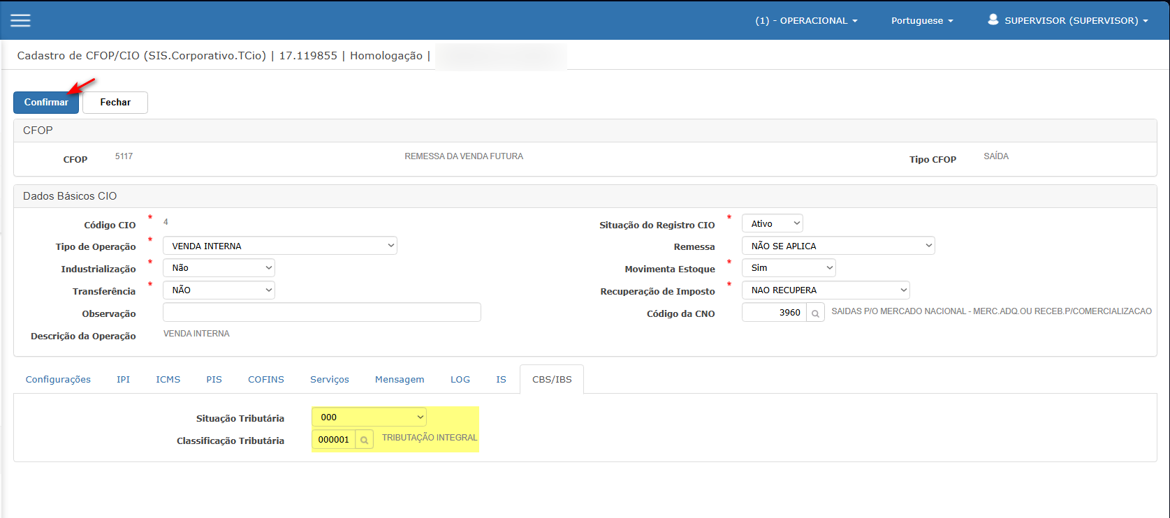 - Selecionar a situação e classificação tributária de CBS/IBS; e confirme a CIO;
