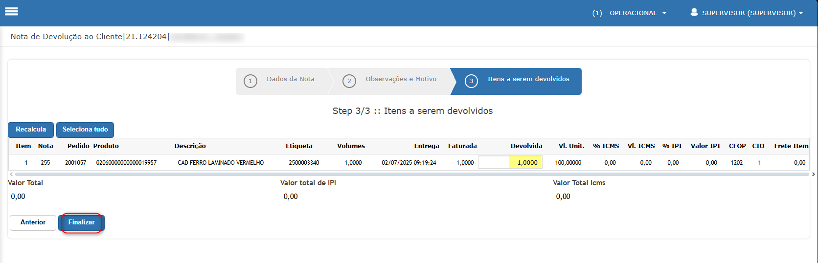 - Exemplo, devolução de nota fiscal: