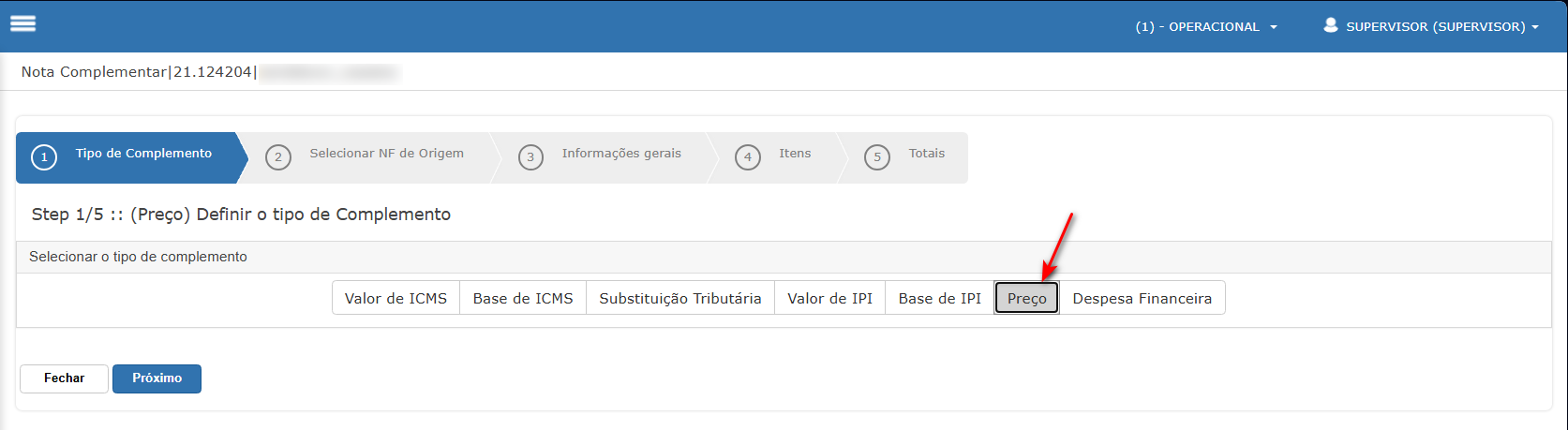 Cenário: Nota Complementar - Preço.