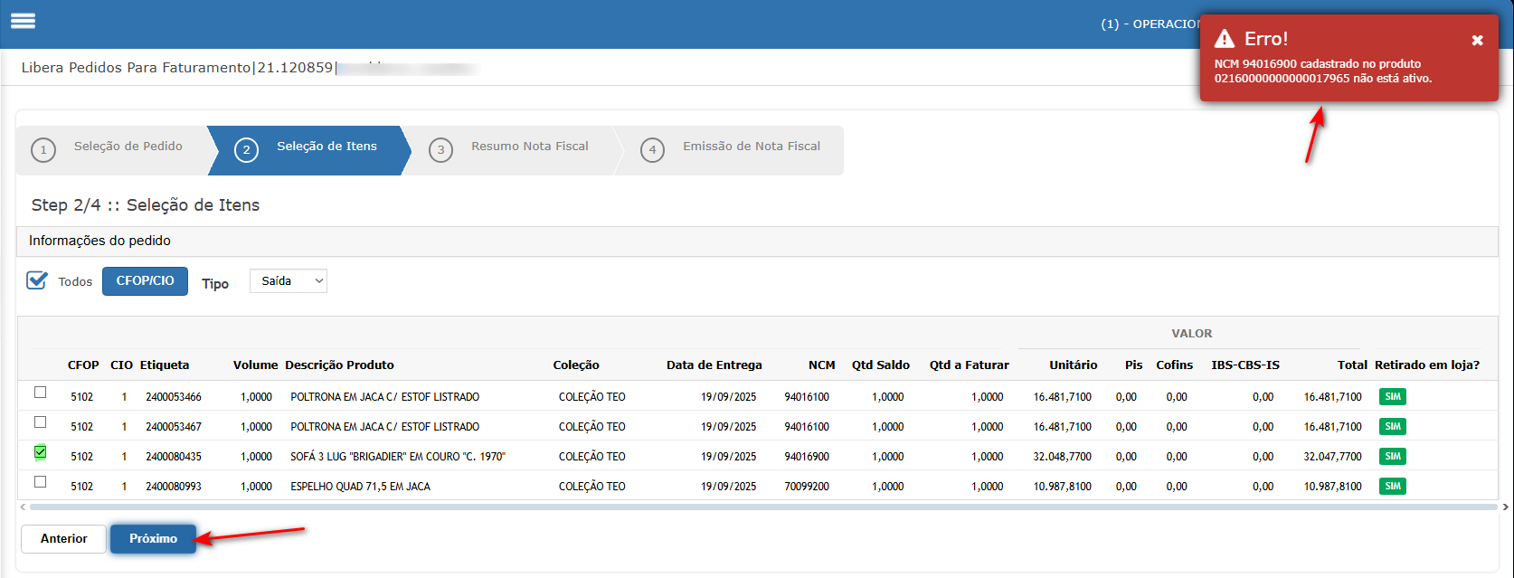 Neste cenário iremos gerar nota fiscal de um pedido que possua o NCM do item inativado;