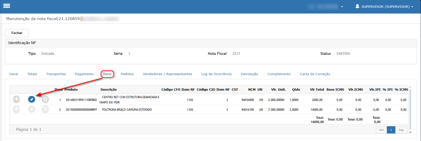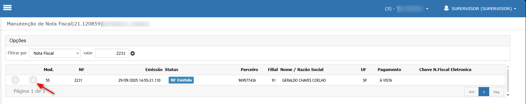 - Editar a nota fiscal desejada, lembrando que exibe notas que não foram transmitidas ou canceladas.