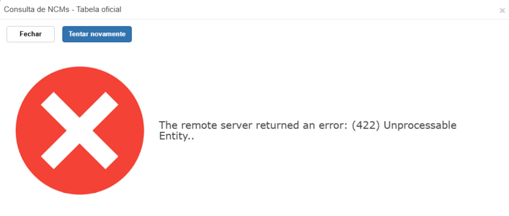 Caso o serviço da API esteja fora do ar poderá exibir a mensagem abaixo (instabilidade por parte do portal único, aguardar normalização pela sefaz):