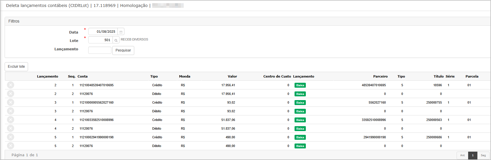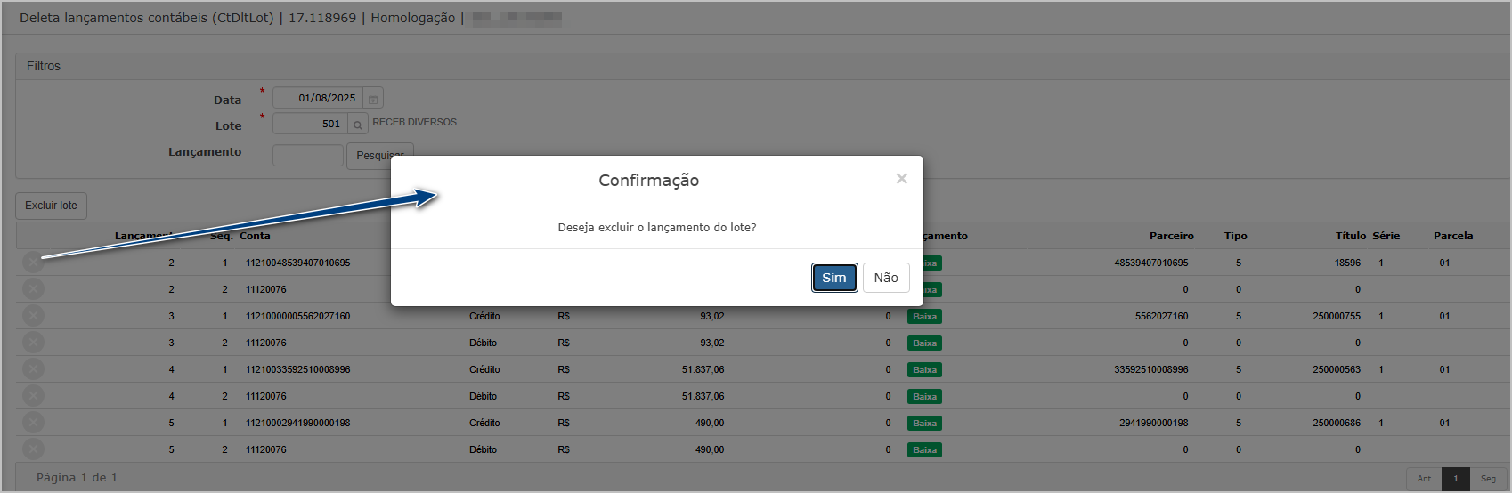 Na tela de integração, informe a data e lote. No grid clique em cancelar lançamento.