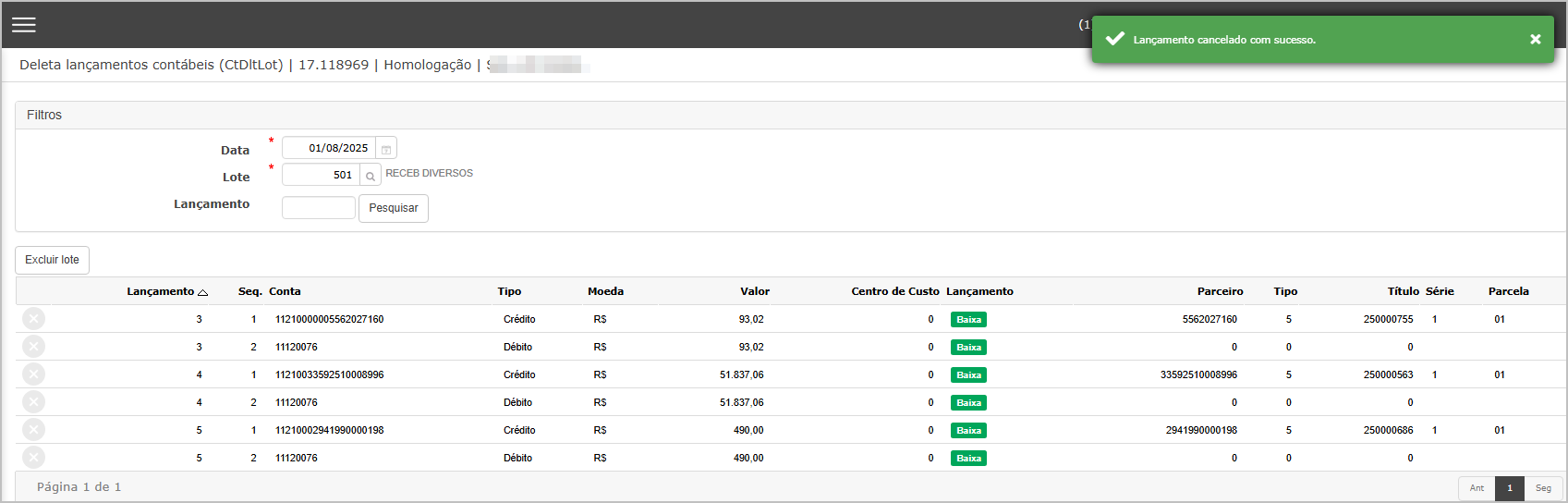 Cenário 1: Cancelamento de lançamento - Contas a Receber