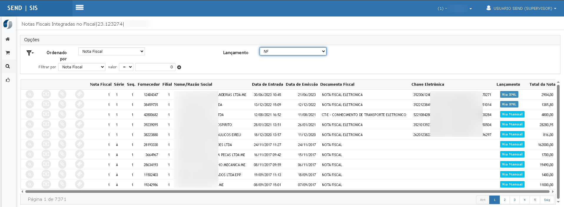 Devem ser exibidas apenas notas com lançamento Via Manual ou Via XML.