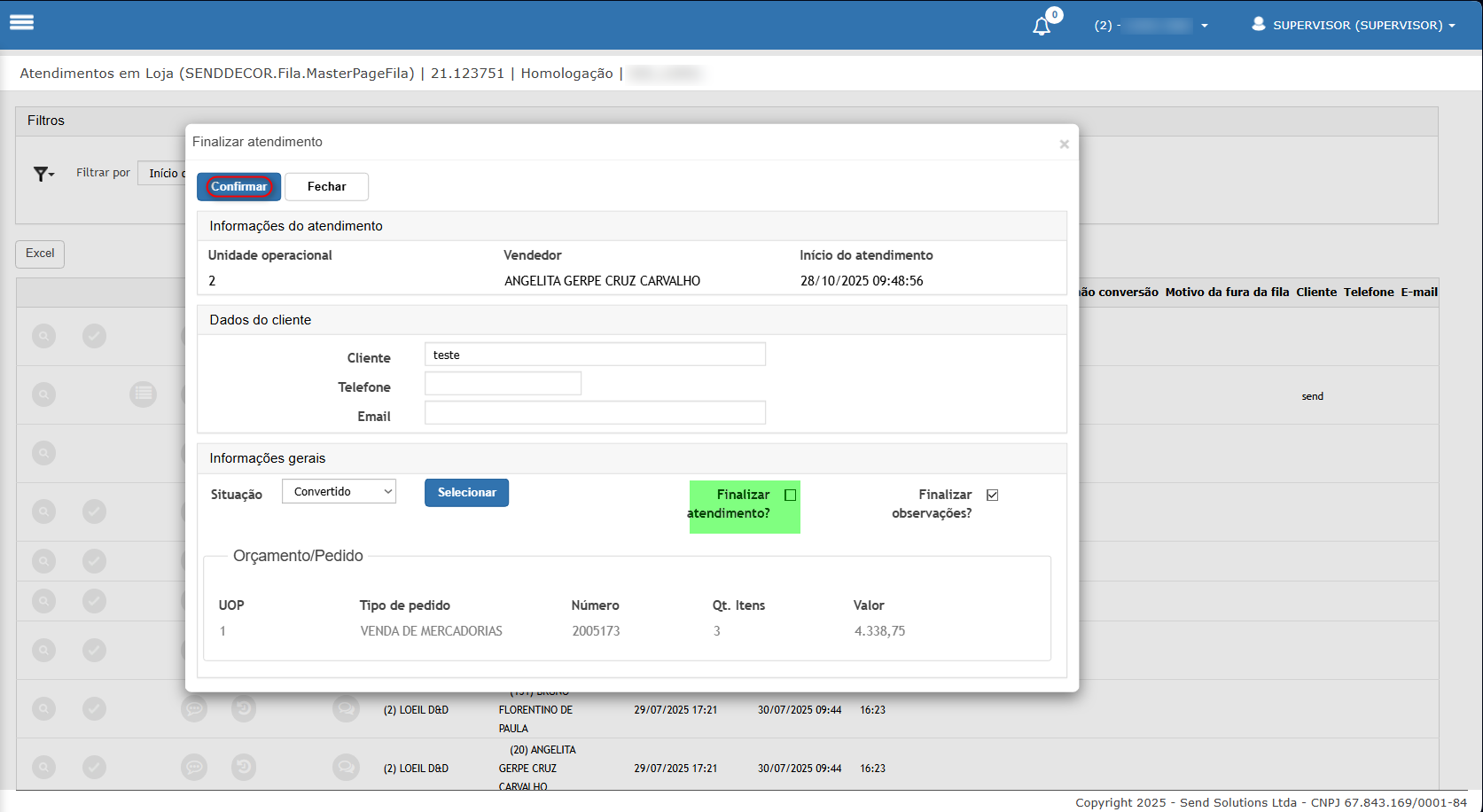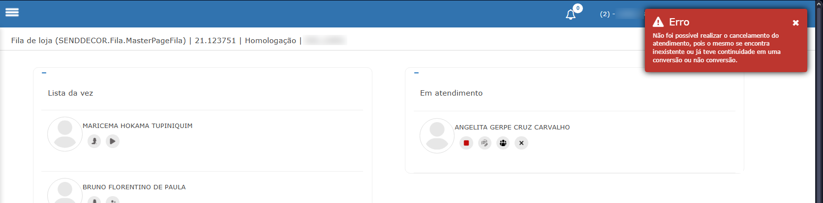 Neste cenário iremos Iniciar atendimento e converter, porem ao tentar cancelar a fila deve exibir validação.