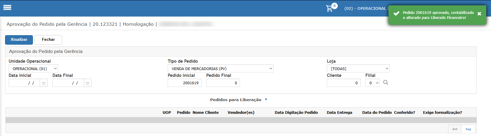 - Portanto, após o faturamento parcial ou total do pedido não se deve permitir cancelar a aprovação do pedido;