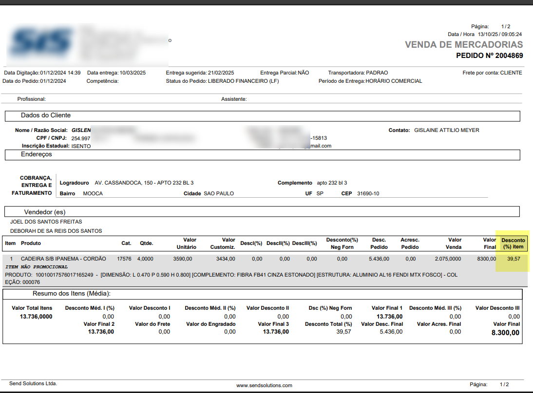 - Esta solicitação tem por objetivo adicionar a campo "Desconto (%) item", no relatório de balanço de vendas em Excel. Presente na impressão na via do escritório.