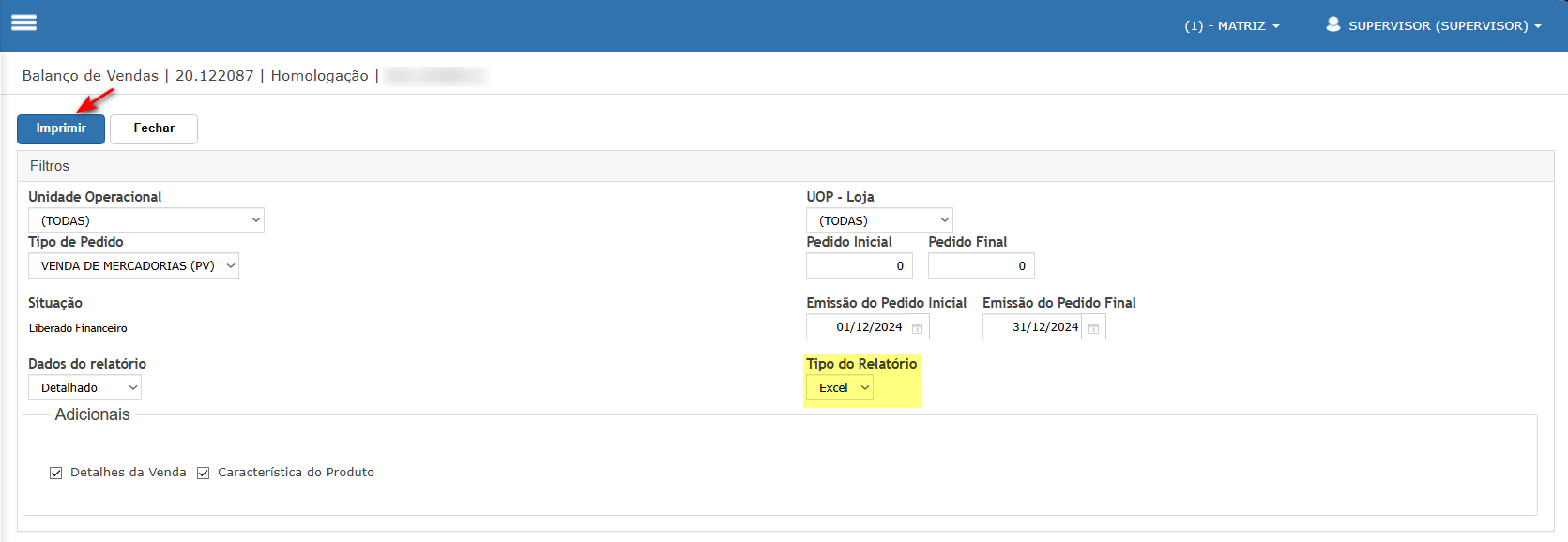 - Informar os filtros conforme desejado e aperte em imprimir;
