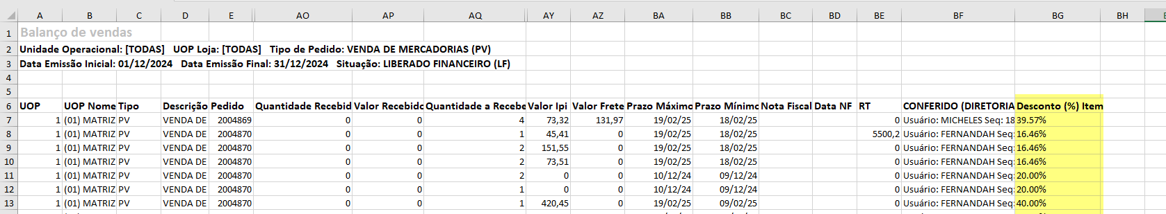 • Esta solicitação tem por objetivo adicionar a campo "Desconto (%) item", no relatório de balanço de vendas em Excel. Presente na impressão na via do escritório.