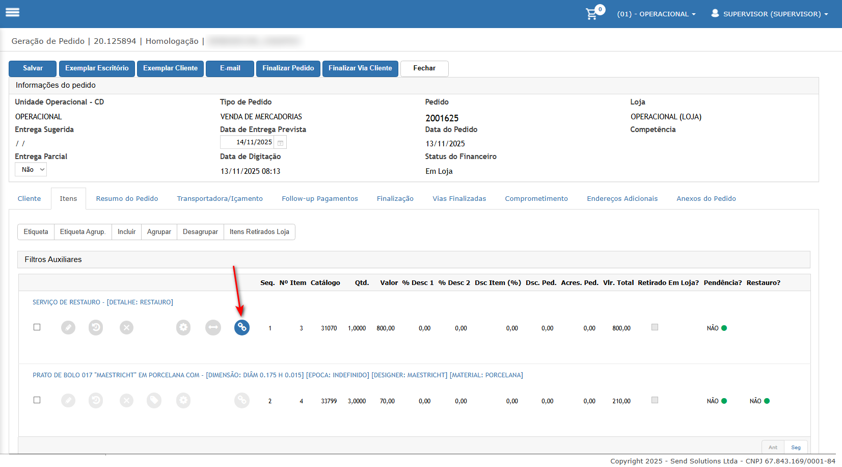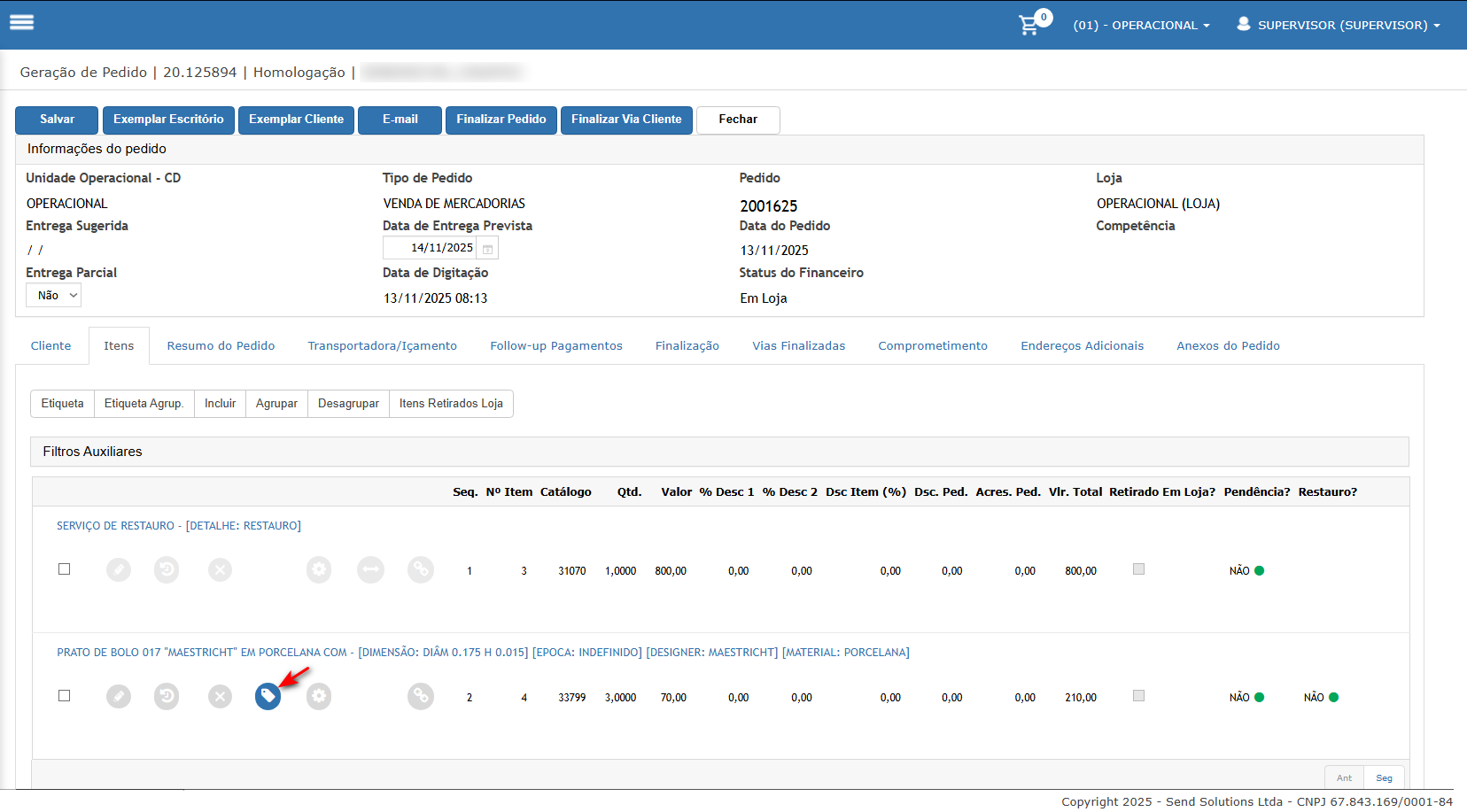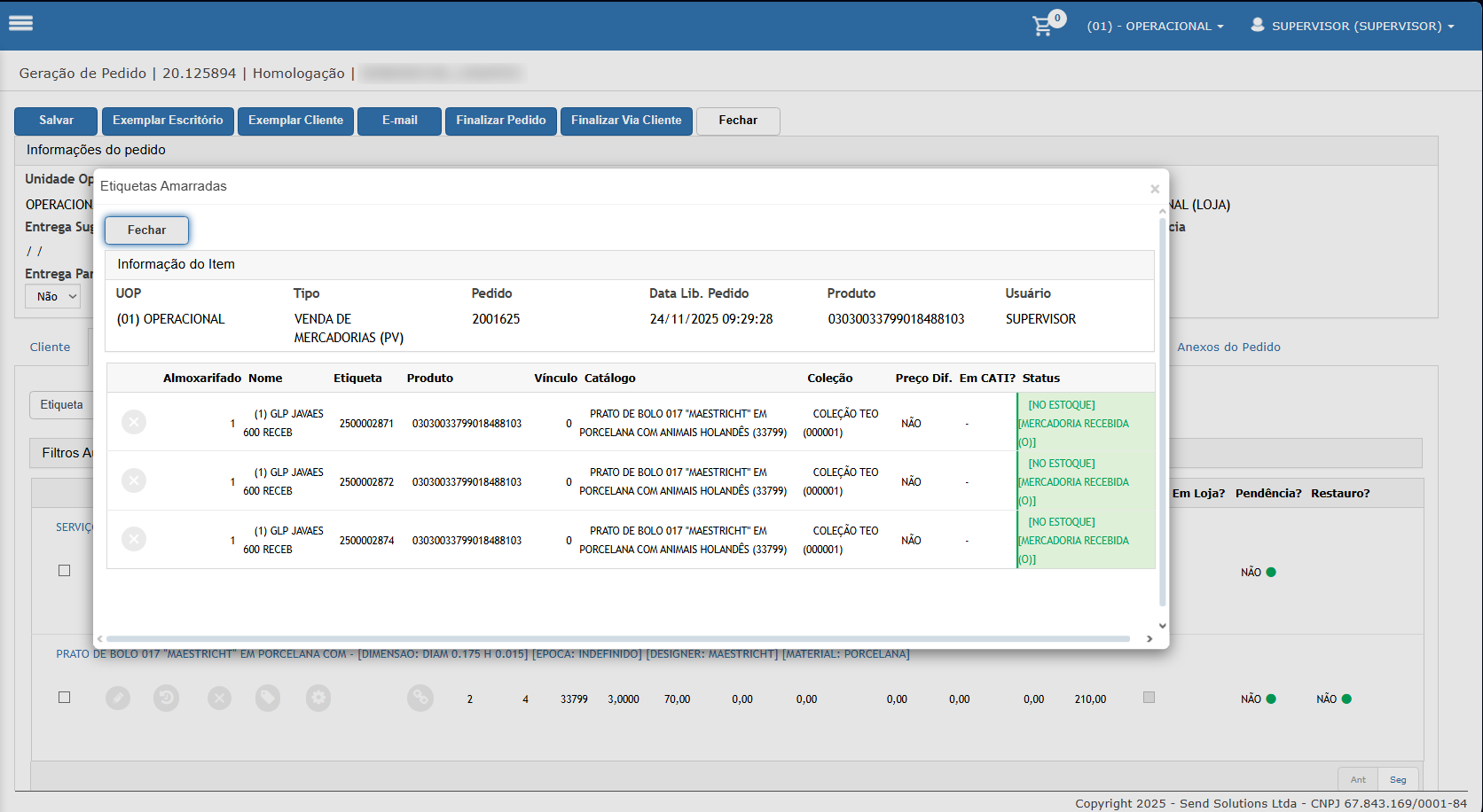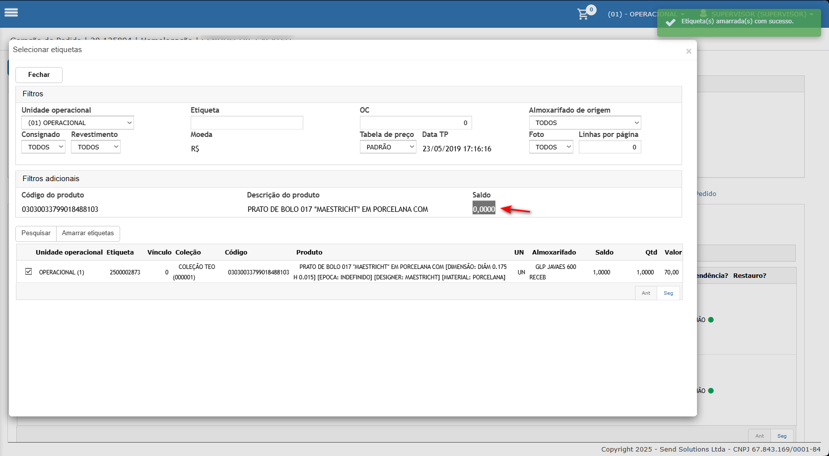 - Acesse a opção de amarrar etiqueta do item, note que existe o saldo do pedido, assim possível selecionar