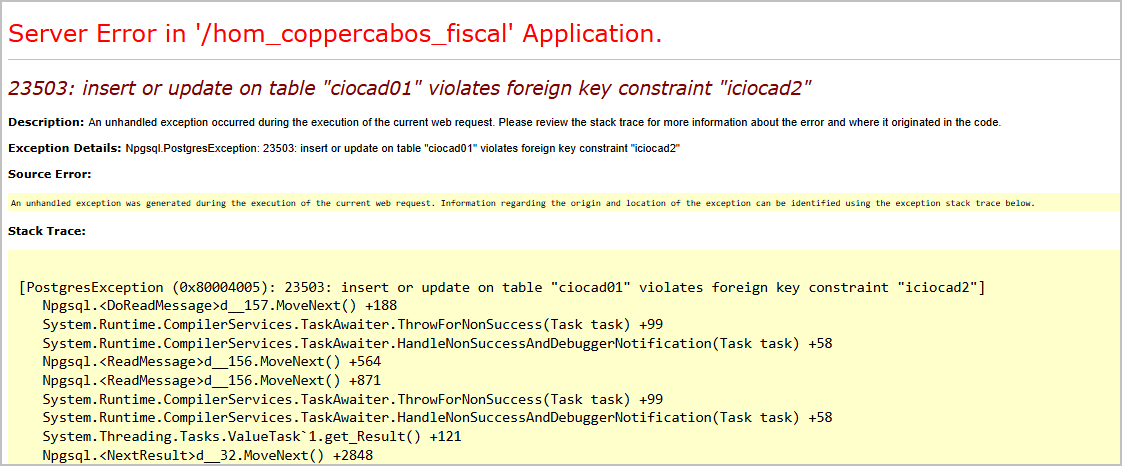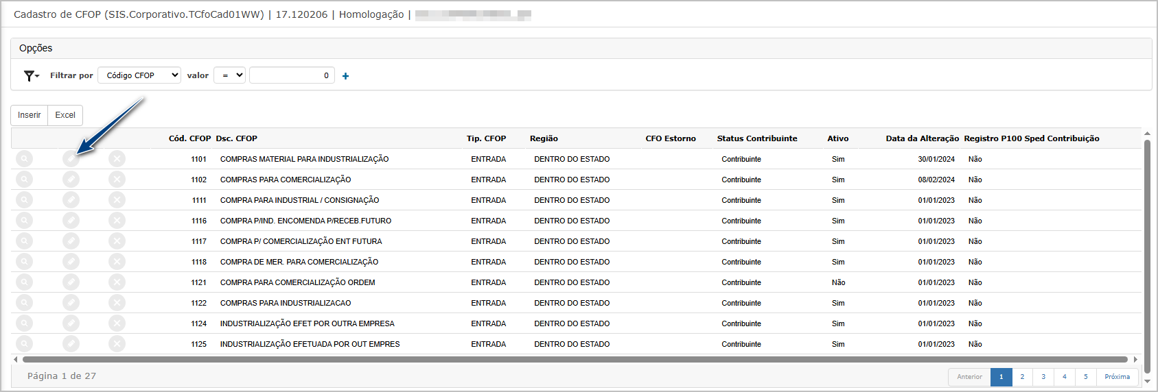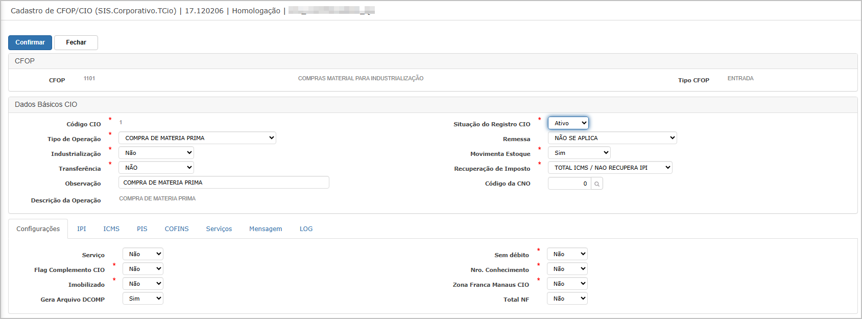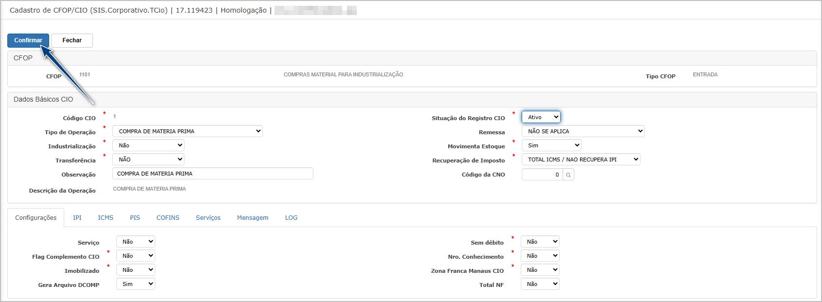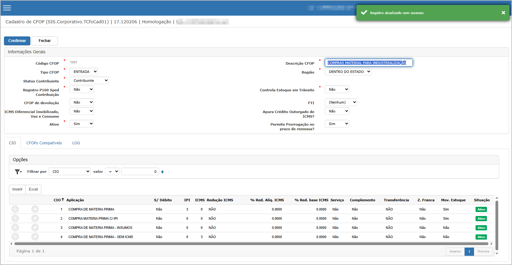 Resultado Esperado: O Cadastro da CIO na CFOP deve ser gravado com sucesso, sem exibição de erro.