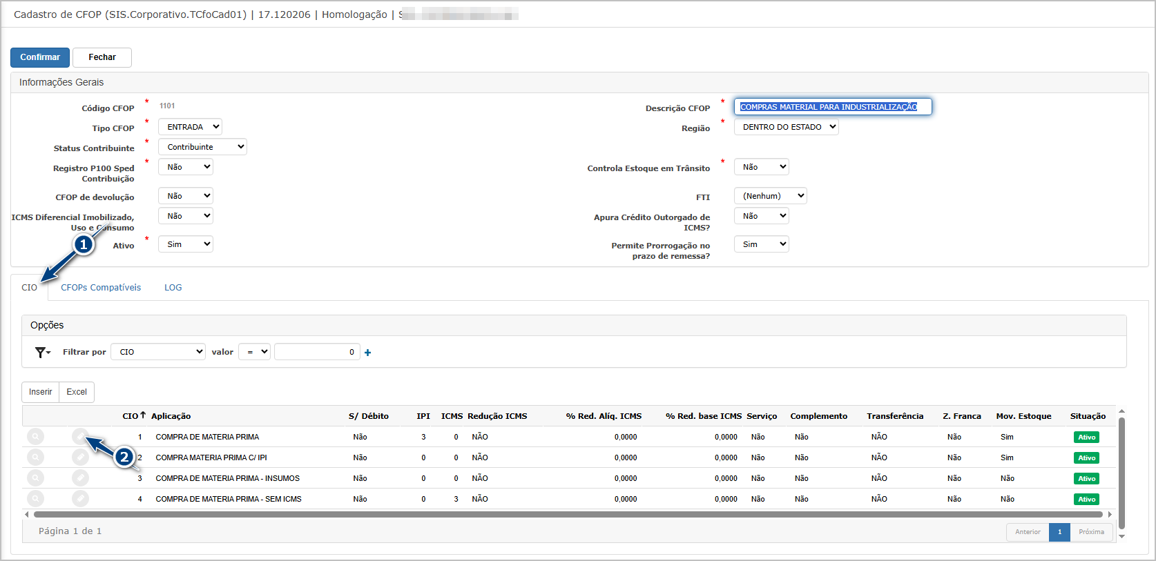 Ao abrir a tela, vá até a Aba de CIO (1) e clique em editar da CIO (2) desejada. Altere as informações desejadas e clique em Confirmar.