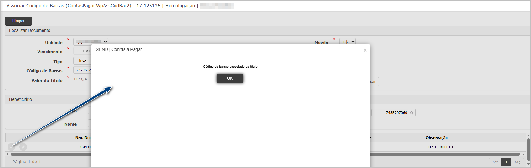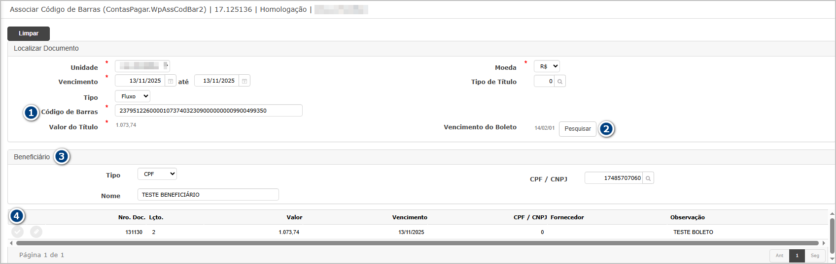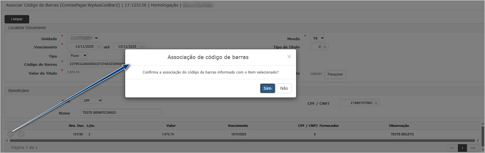 Cenário 3: Contas a Pagar - Associar Código de Barras ao Fluxo