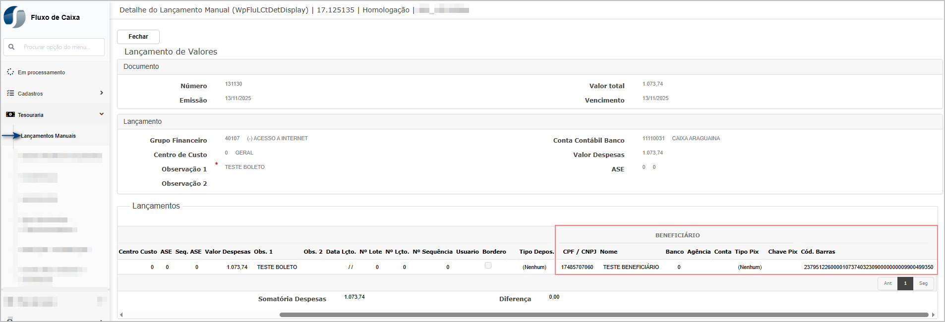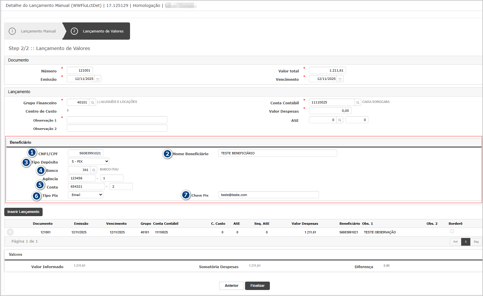 No passo de lançamento de valores, note que foi adicionado o bloco Beneficiário dentro do lançamento.
