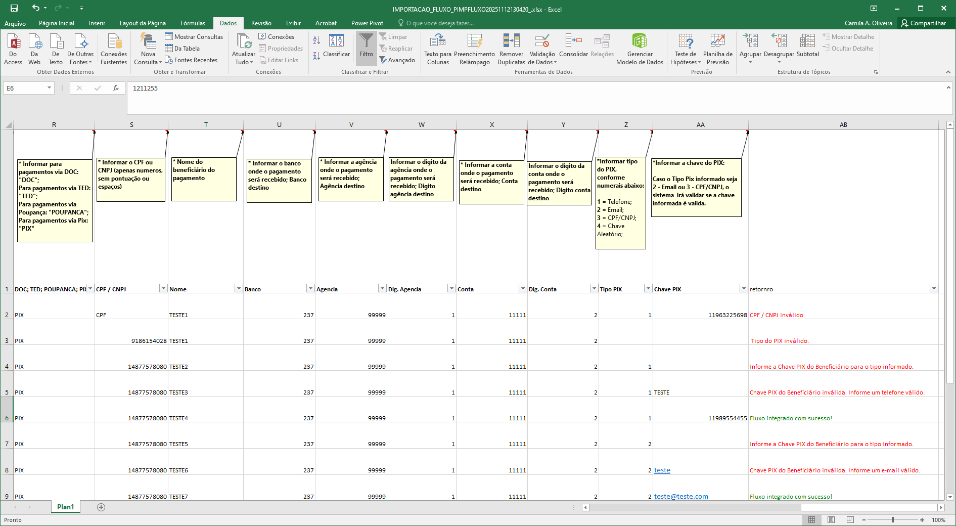 Ao informar no PIX uma chave invalida, a importação é processada, gera um relatório de inconsistência indicando a(s) linha(s) com erro de validação da chave e o lançamento não é gravado.