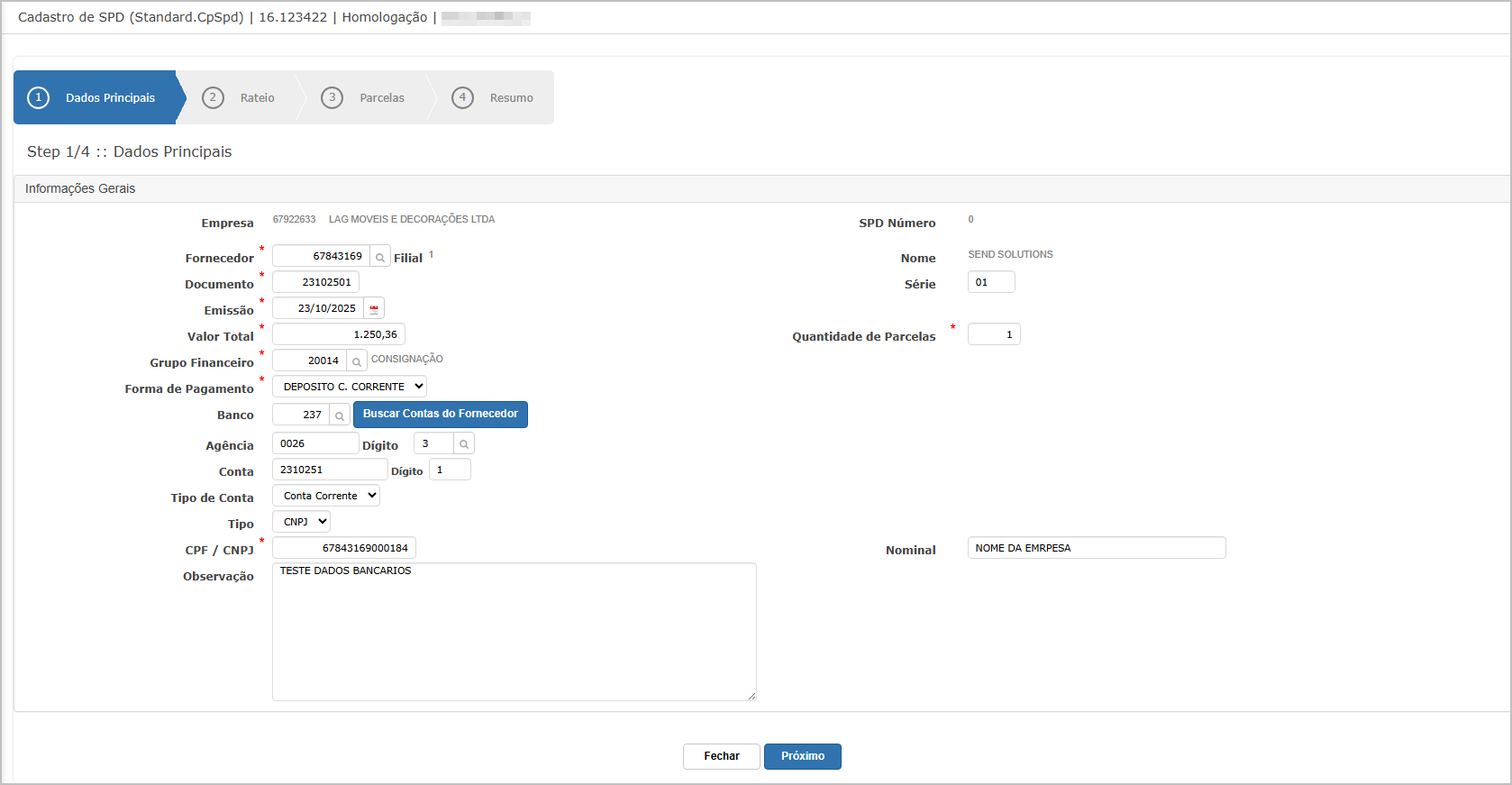 Ao abrir a tela de lançamento de SPD, insira os dados conforme necessidade.