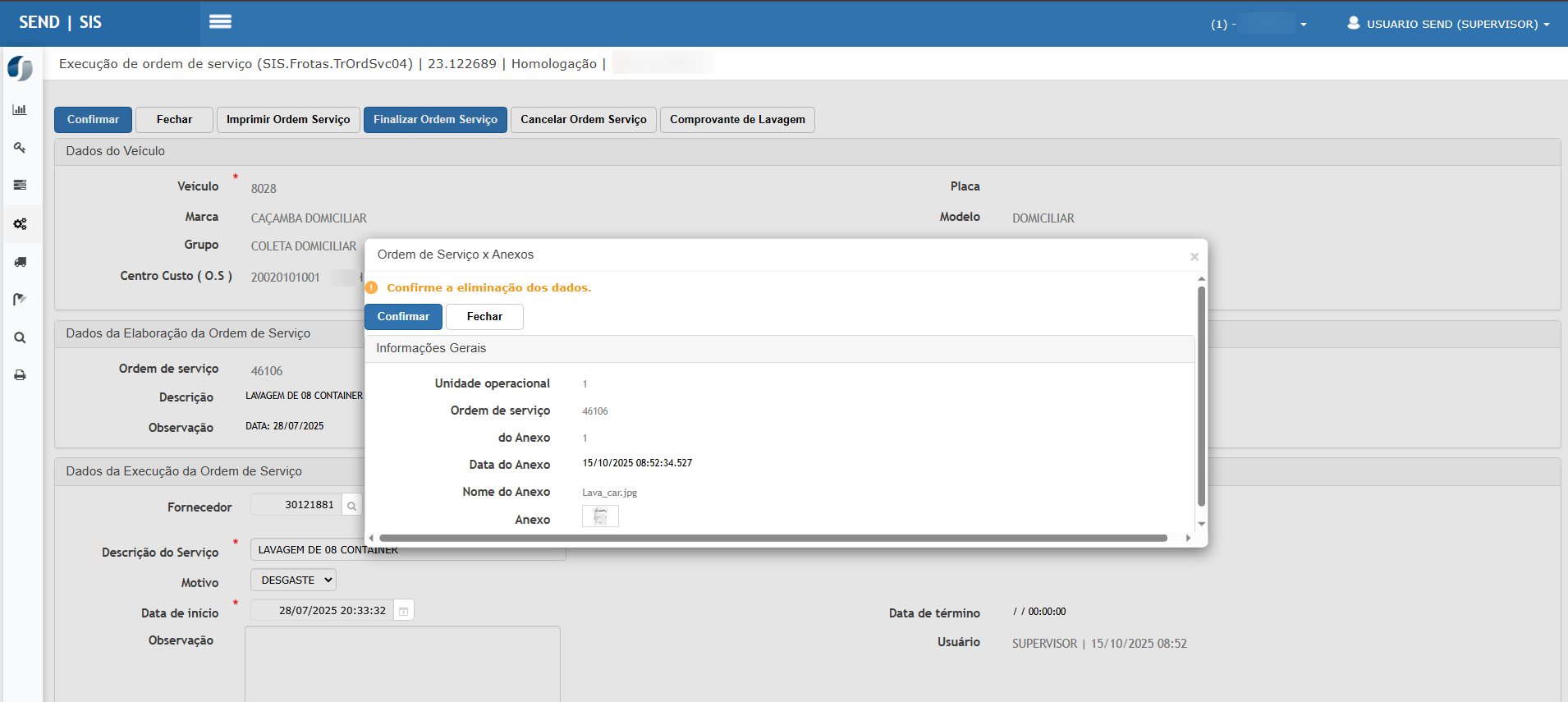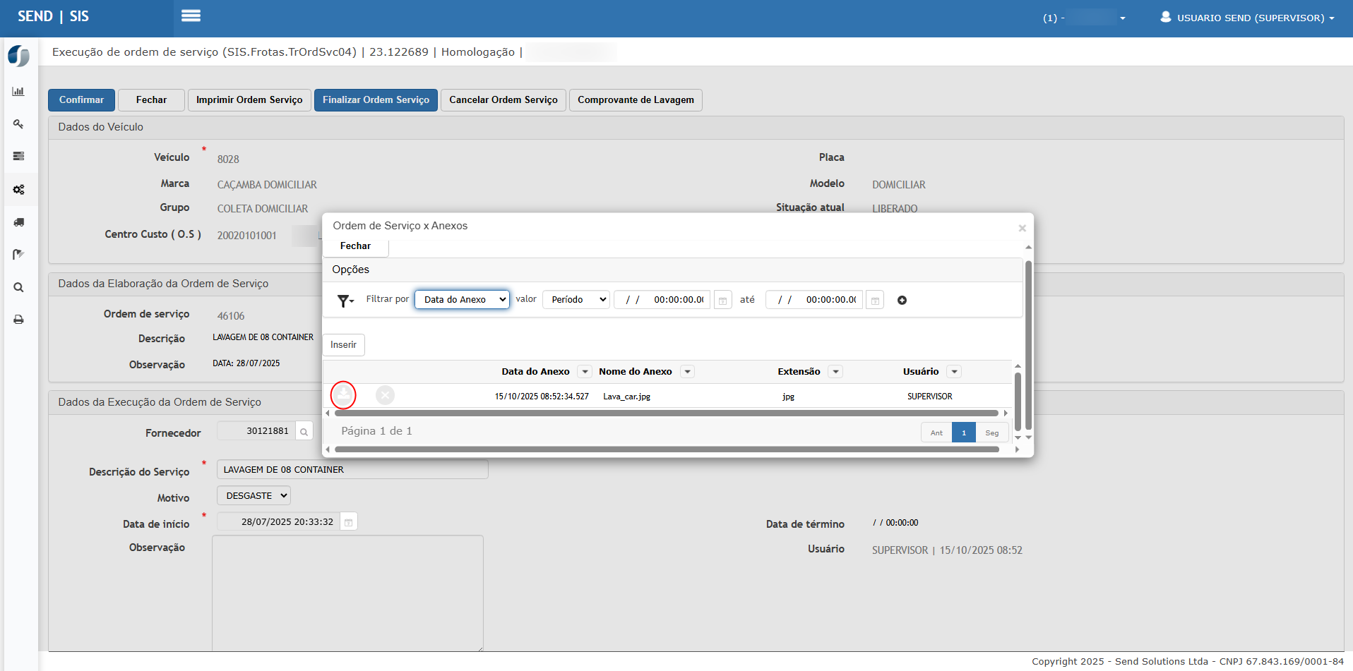 No popup de anexos da OS finalizada, clicar no ícone Excluir (lixeira).