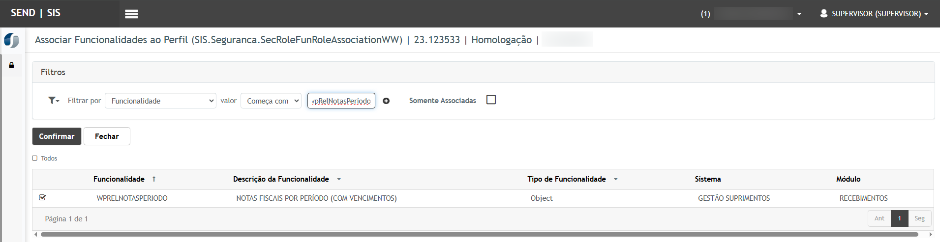 Usuário com a funcionalidade wpRelNotasPeriodo vinculada ao perfil.