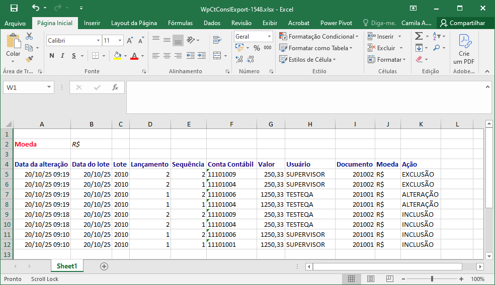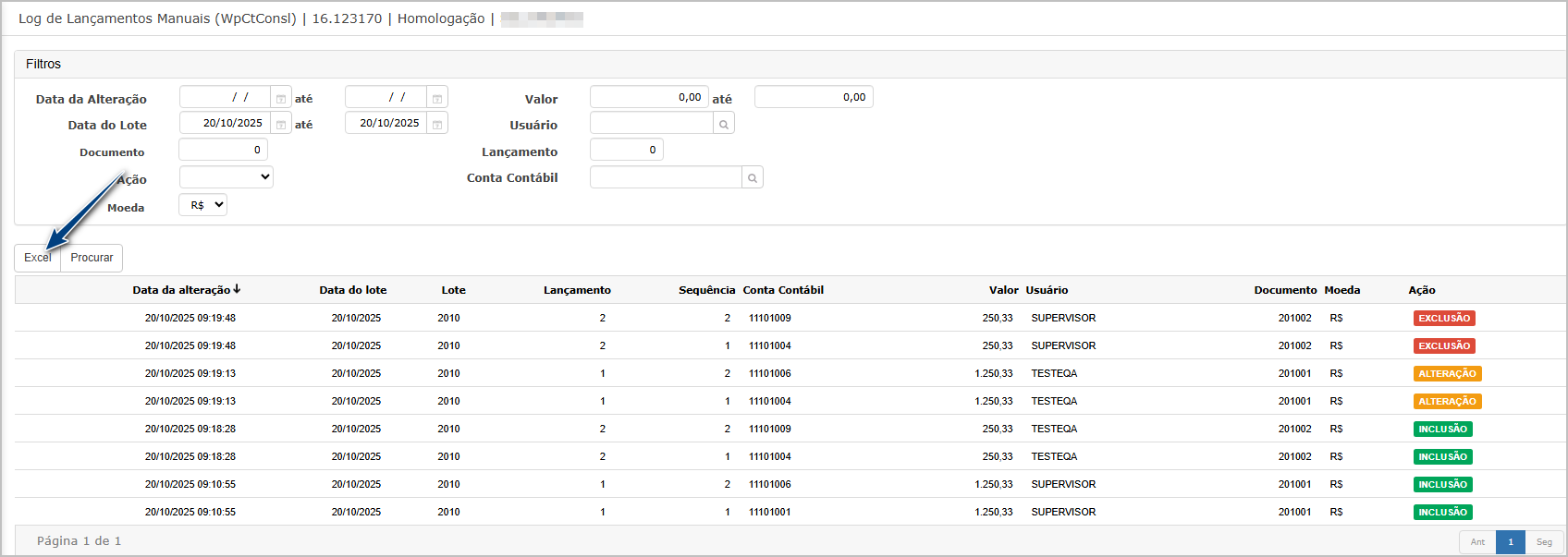 O arquivo exportado deve conter as mesmas informações exibidas na tela, respeitando os filtros aplicados (Data do Lote, Conta Contábil, Ação e Valor).