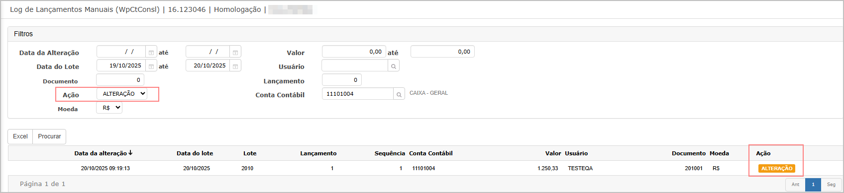 Pesquisa por Ação: A listagem deve exibir apenas os registros de log onde a ação registrada foi “Alteração” (neste exemplo).