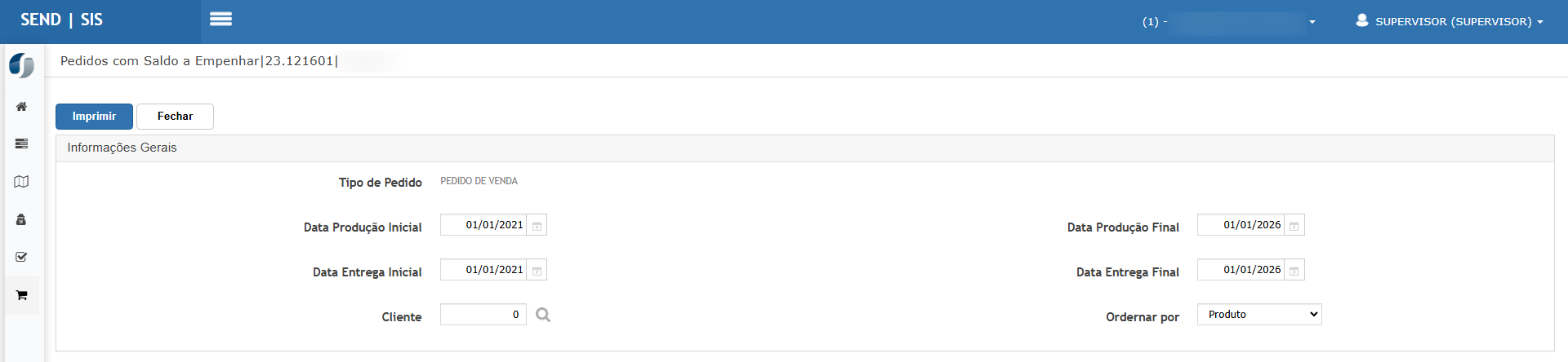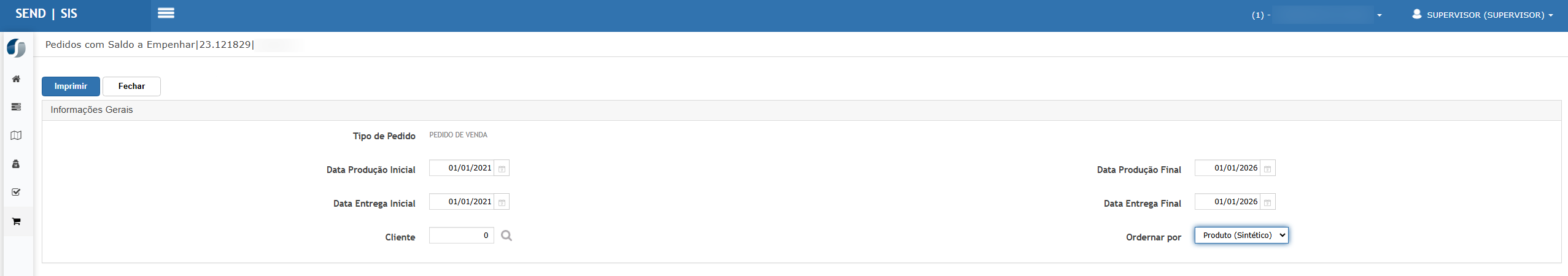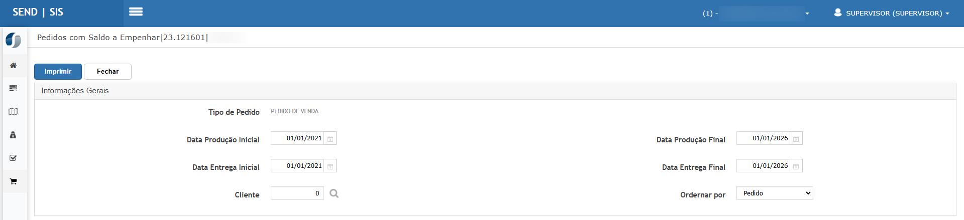 Acessar Logística > Relatórios > Pedidos com Itens Pendentes a Empenhar.