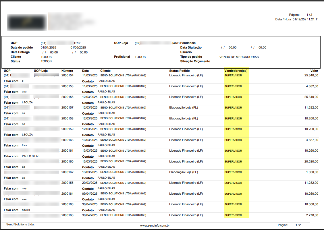 Neste cenário iremos gerar o relatório de pedido/orçamentos e verificar que após as premissas efetuadas, será exibido o relatório conforme o vendedor logado no sistema;