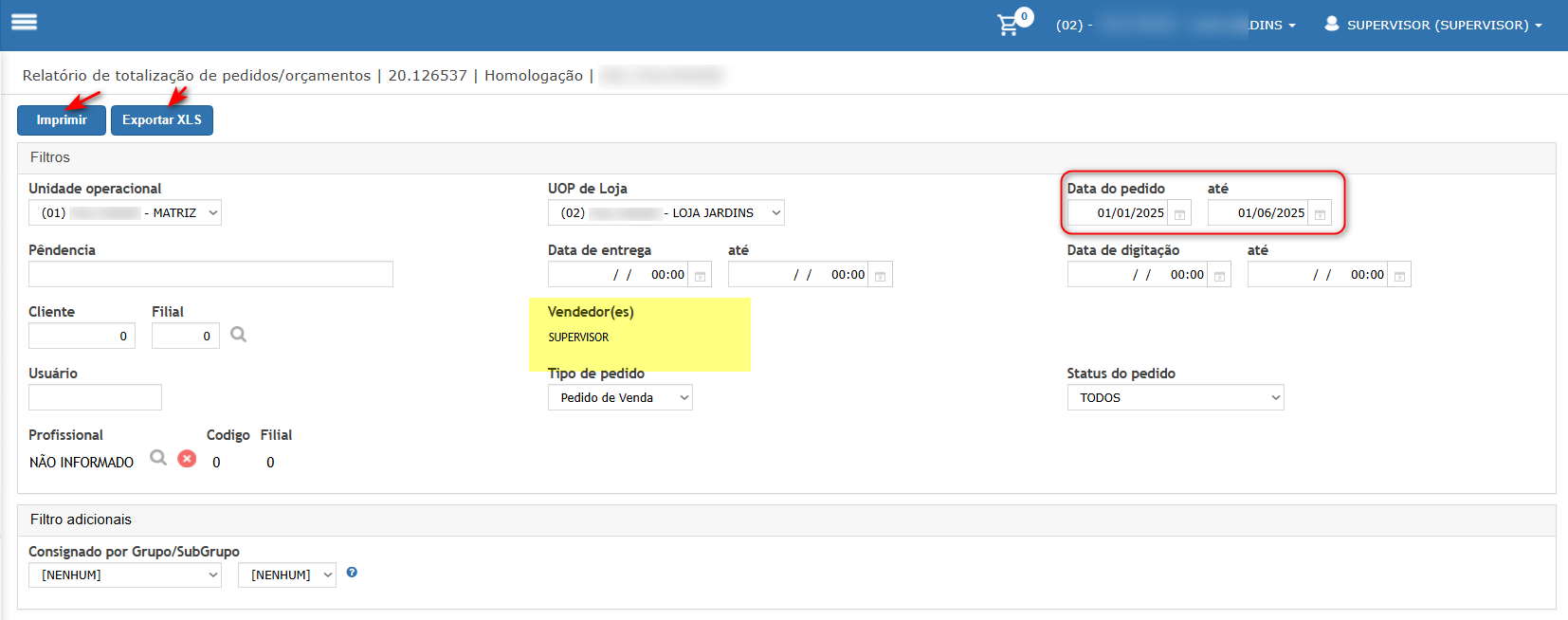 - Preencher os filtros conforme desejar, note que o filtro de vendedor está desabilitado;