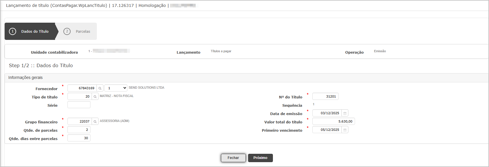 Incluir um novo título preenchendo os campos obrigatórios (Fornecedor, Tipo de Título, Datas, Valores etc.).