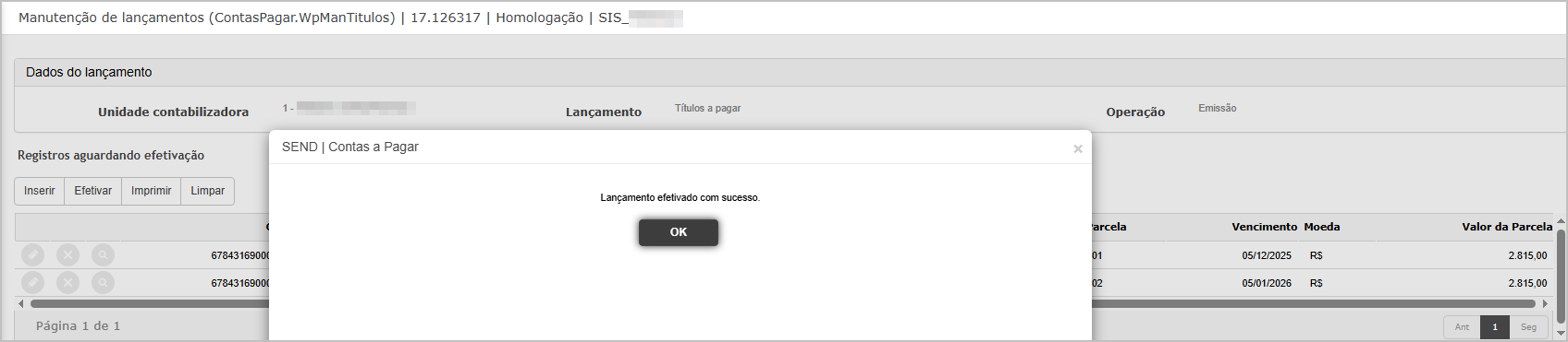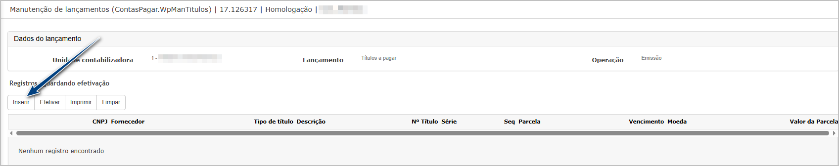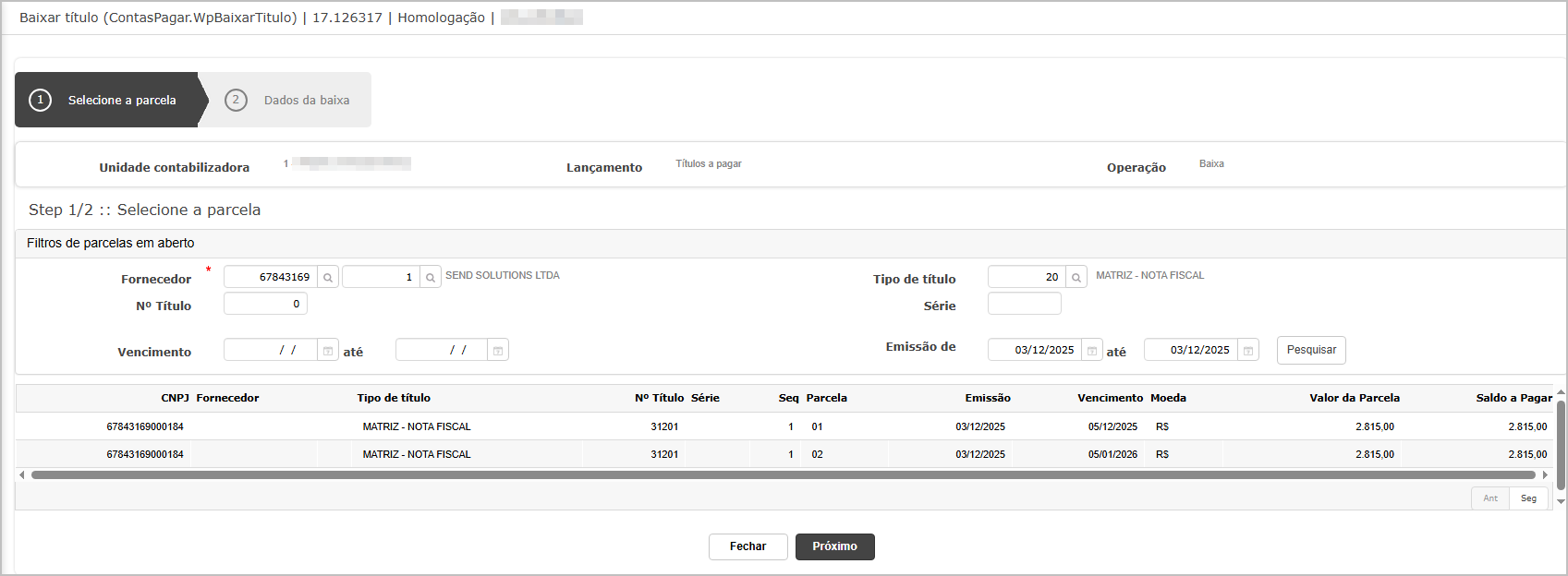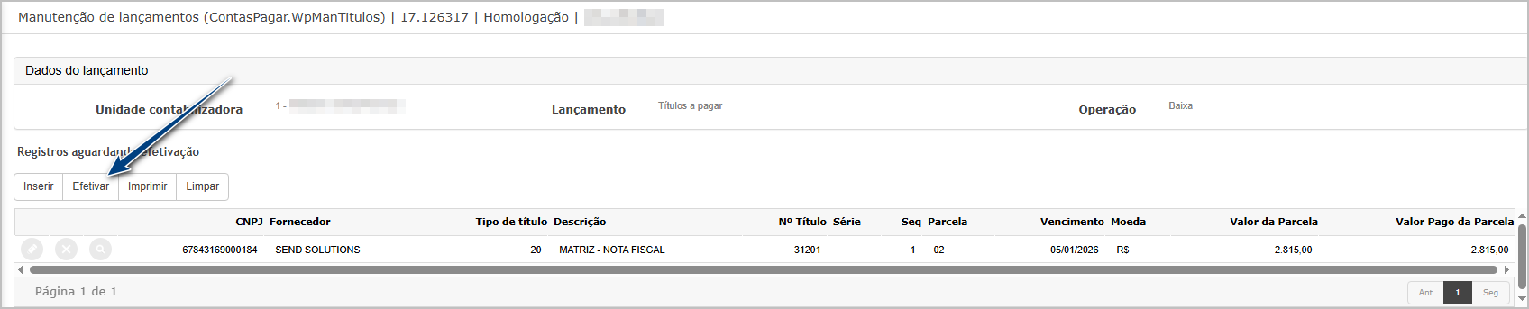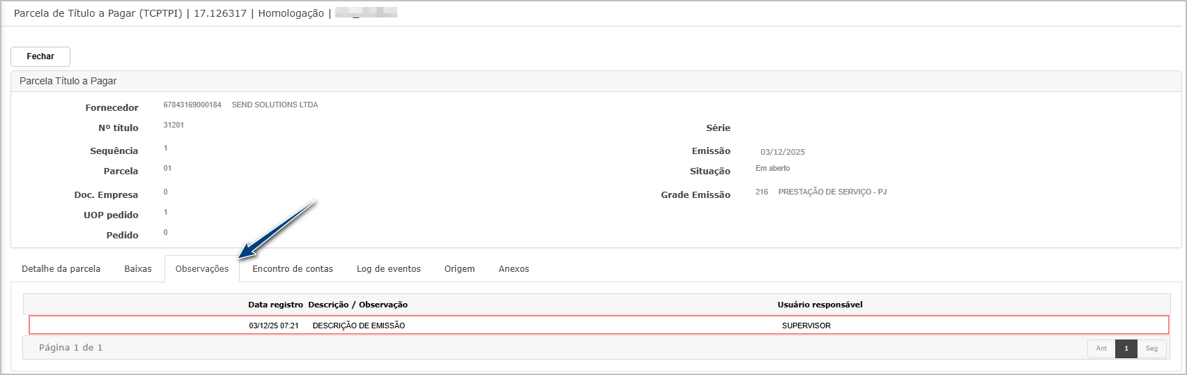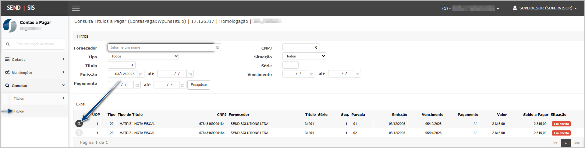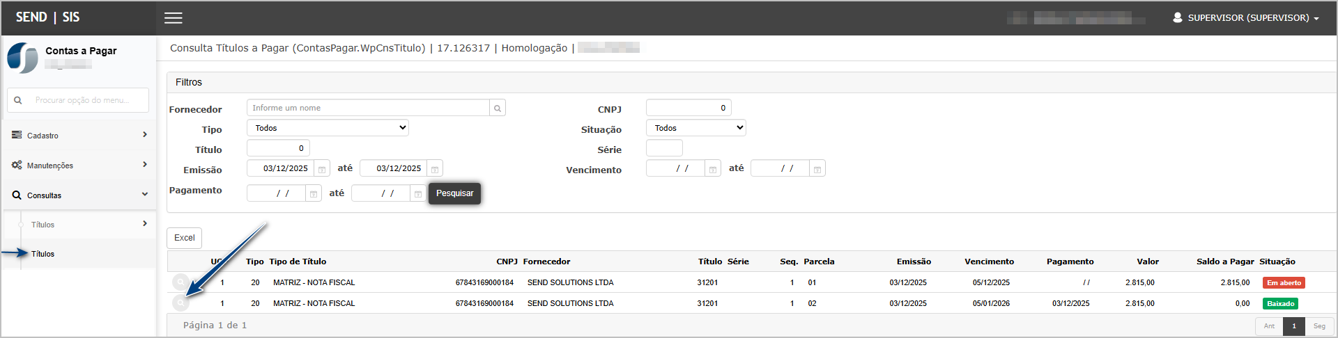 Localizar o título emitido no filtro (por fornecedor, data, número, valor etc.) e abrir o detalhe.