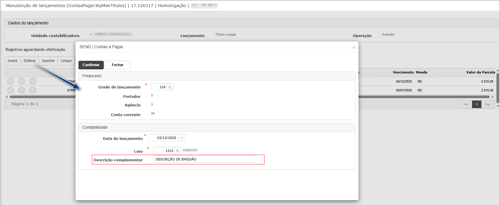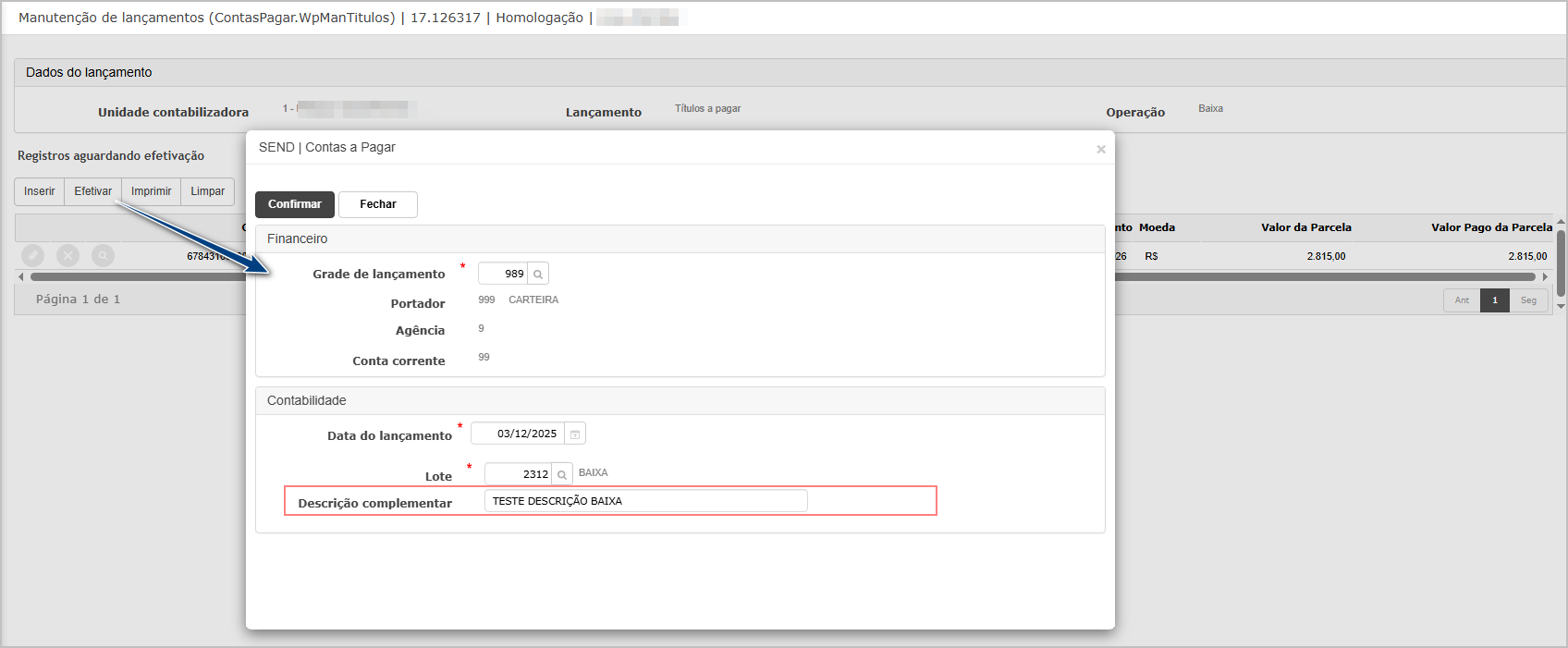 Assim, a descrição que o usuário informa para identificar o motivo do lançamento deixa de ficar “escondida” apenas no momento da efetivação e passa a ficar disponível para consulta direta dentro do título, atendendo à necessidade reportada pelo cliente de enxergar a observação na tela de detalhe do título.