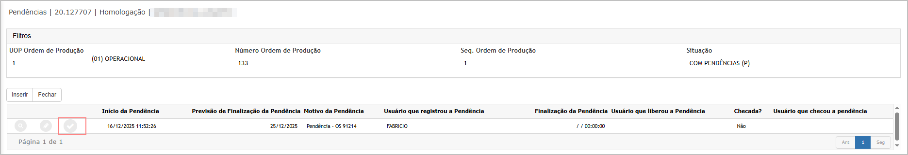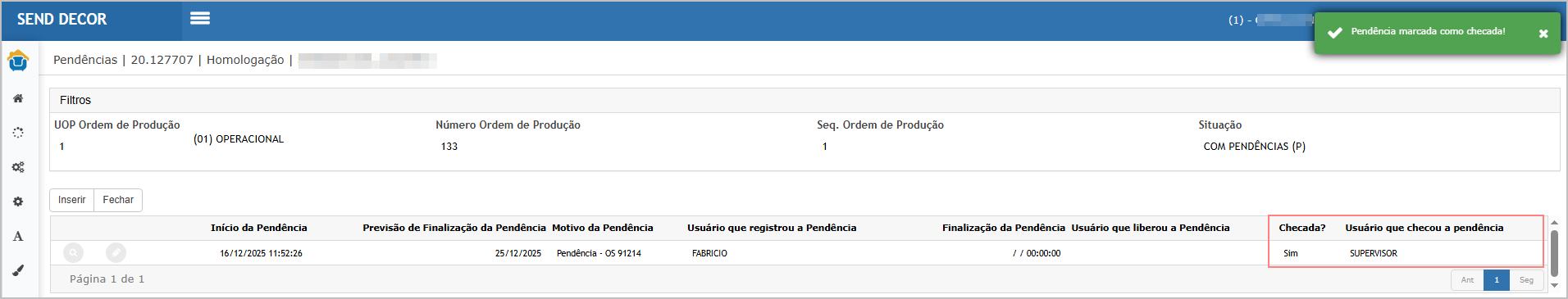 Premissa: Ter uma pendência cadastrada e pendente de checagem.