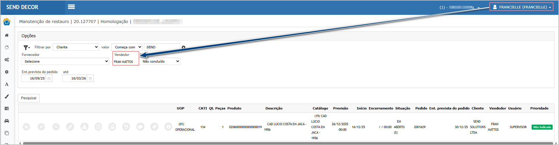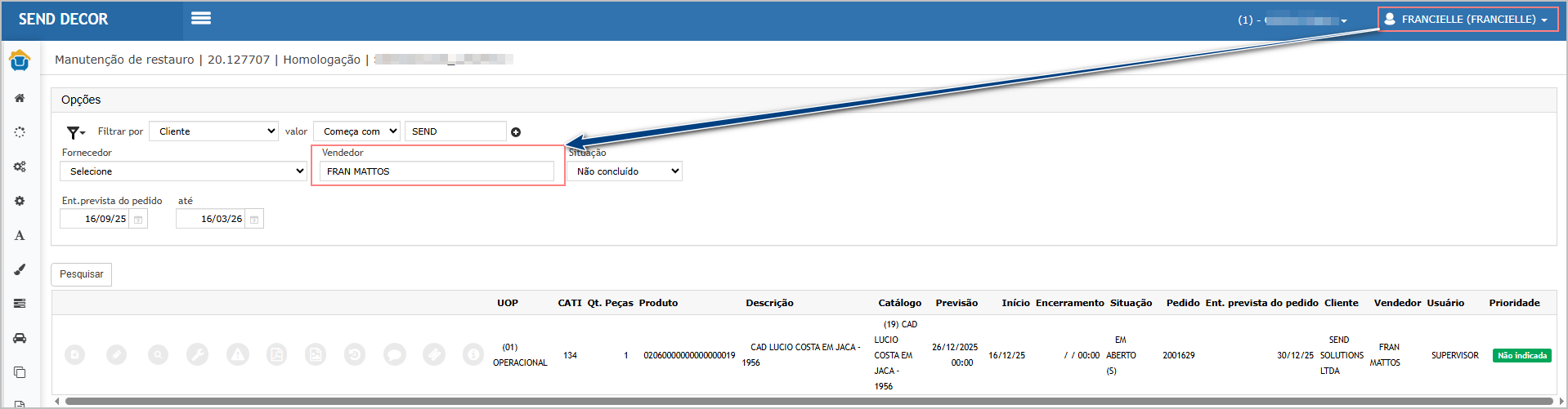 - O Filtro de vendedor deve ser desabilitado para edição e carregado com o vendedor logado.
