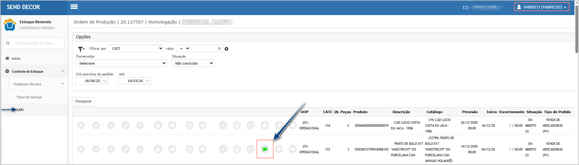 Ao acessar o módulo de estoque revenda no menu CATI, o ícone de observação deve ser verde