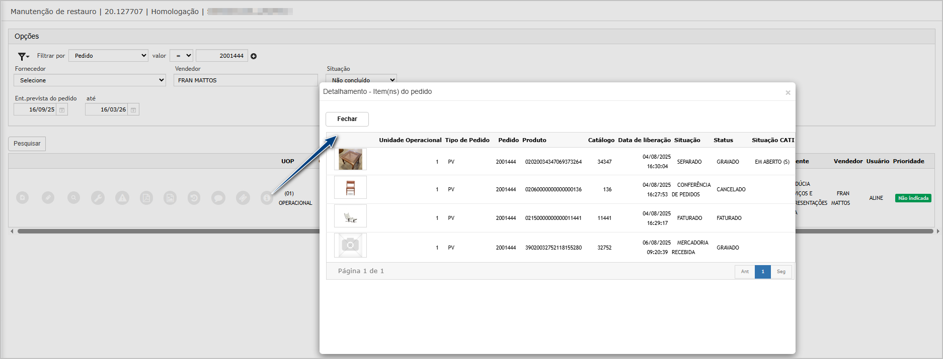 Cenário 3: Manutenção de Reparo - Exibir itens do pedido com imagem e status.