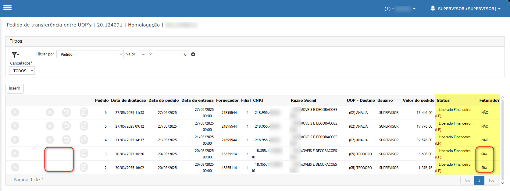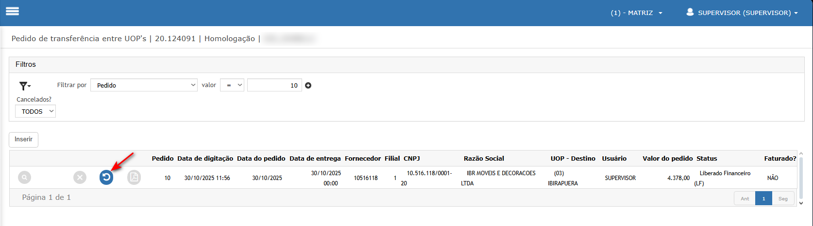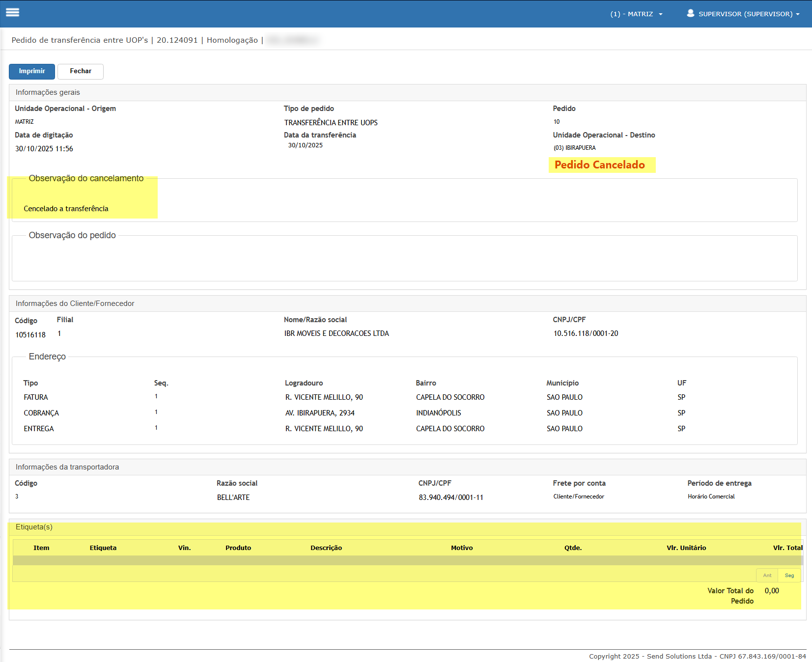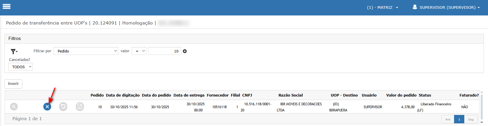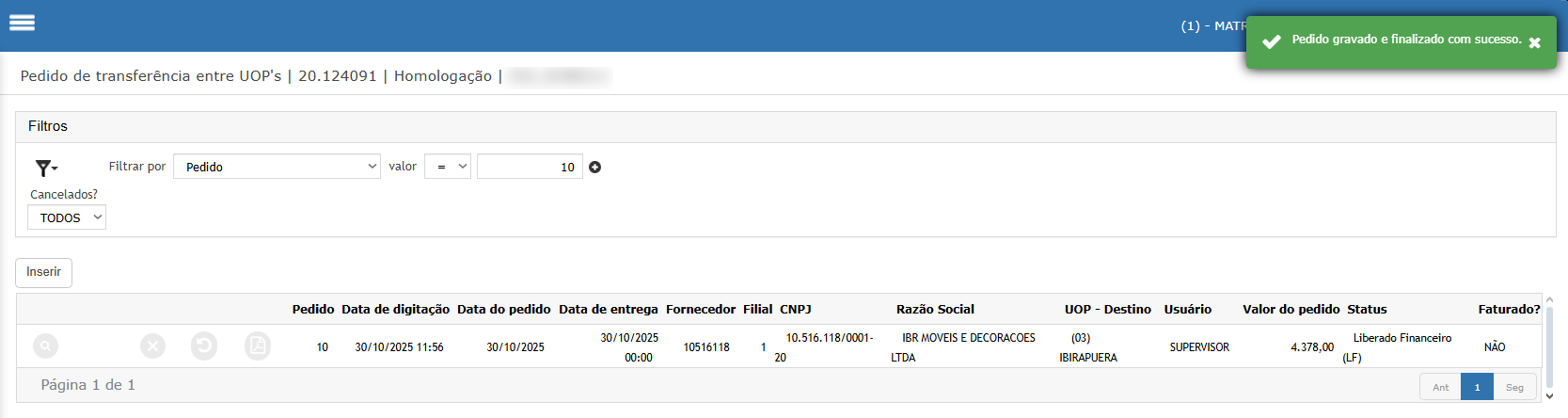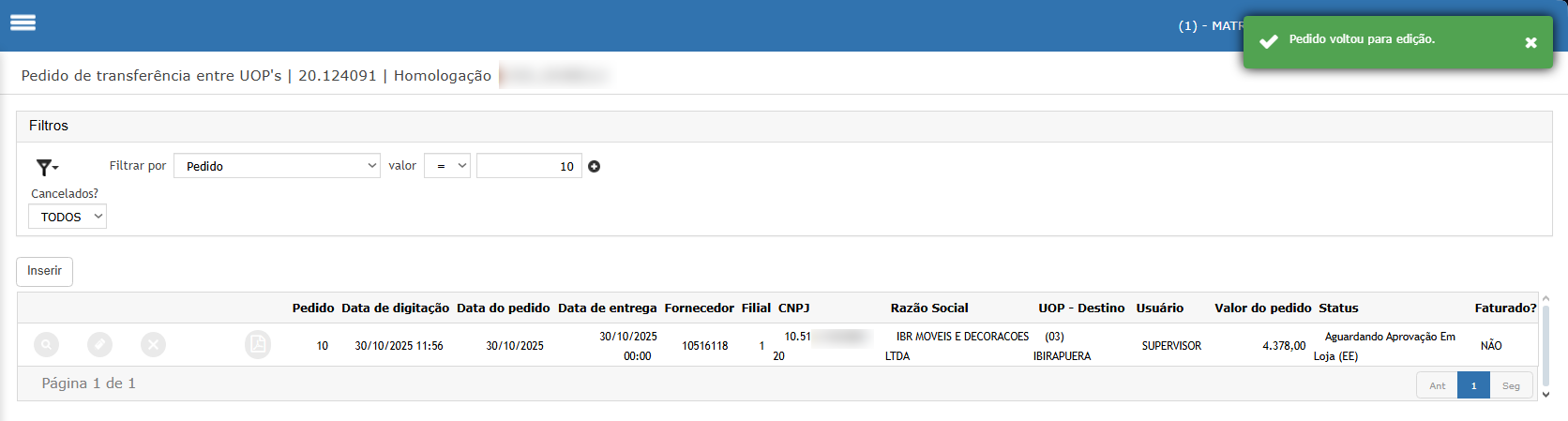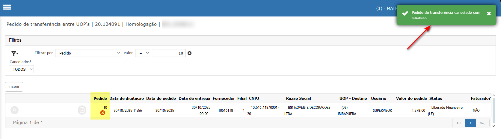 Assim validamos que pedidos com status de faturado não será possível cancelar/voltar o pedido de transferência entre unidades.