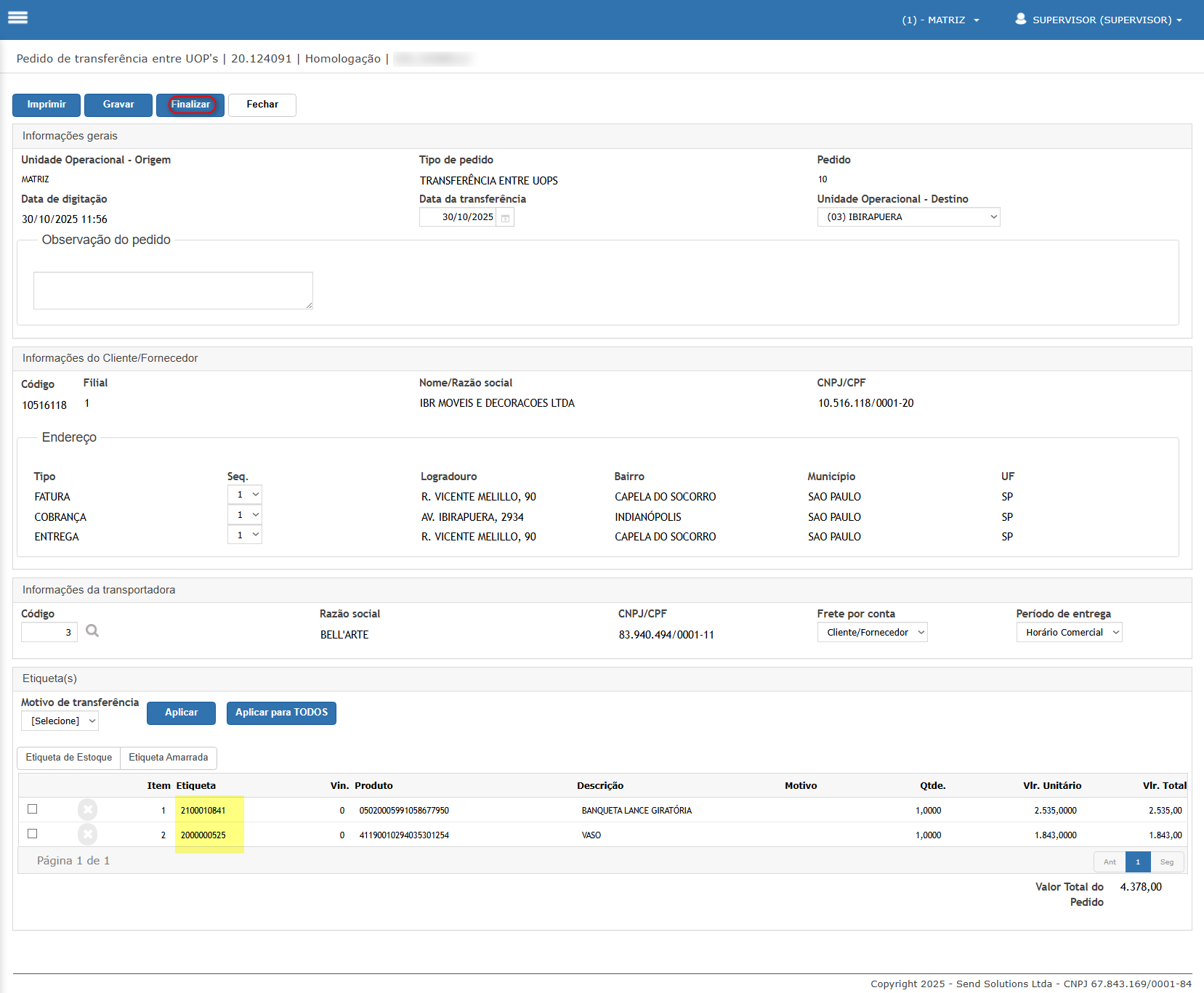 - Inserir a etiqueta sendo amarradas ao pedido ou estoque e finalizar o lançamento