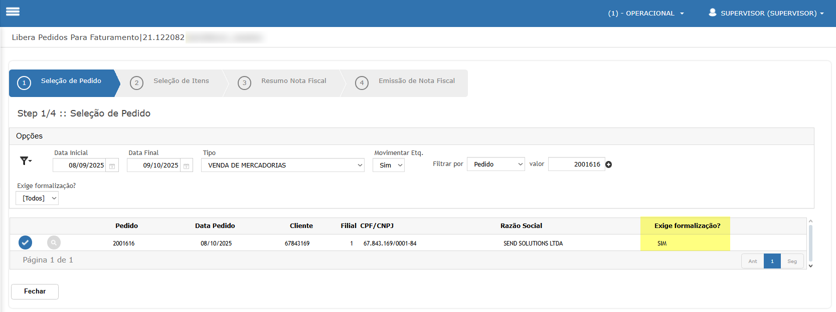 Validação: Formalização no faturamento