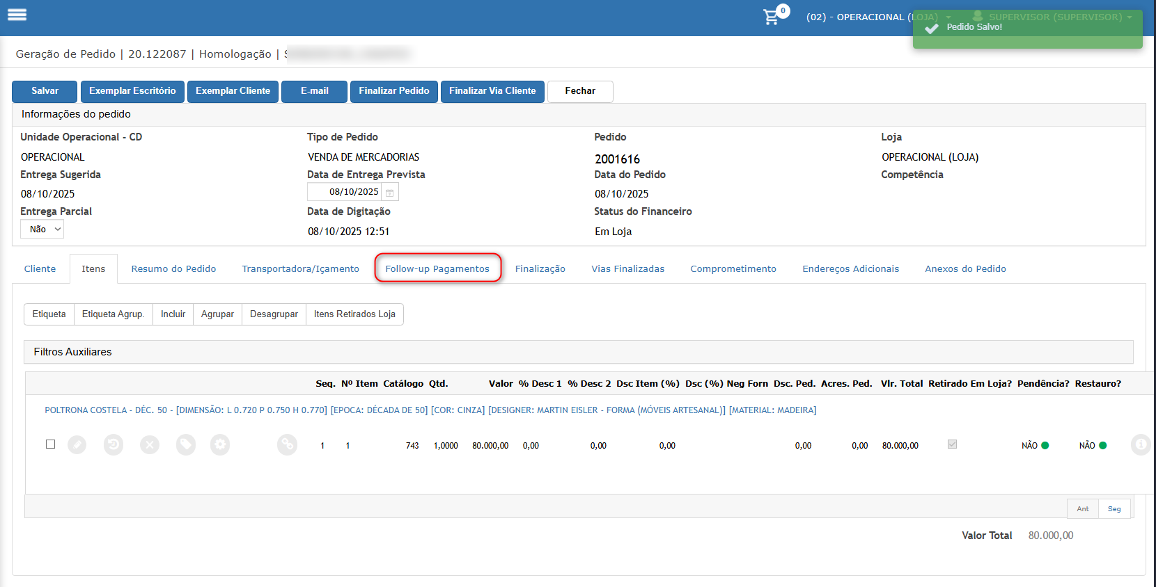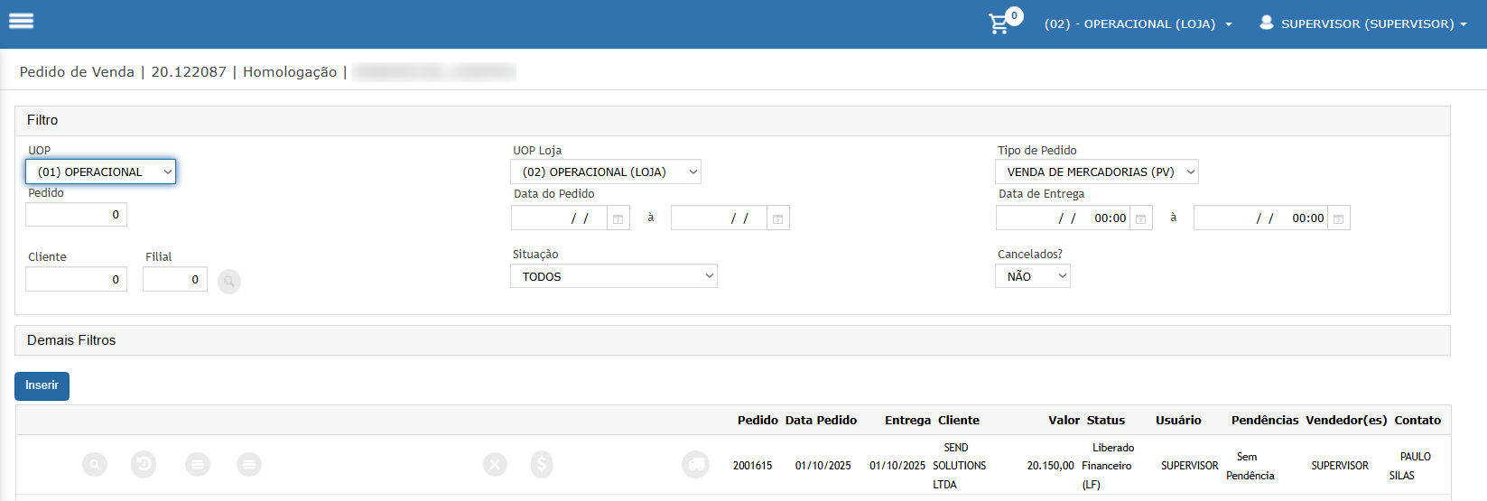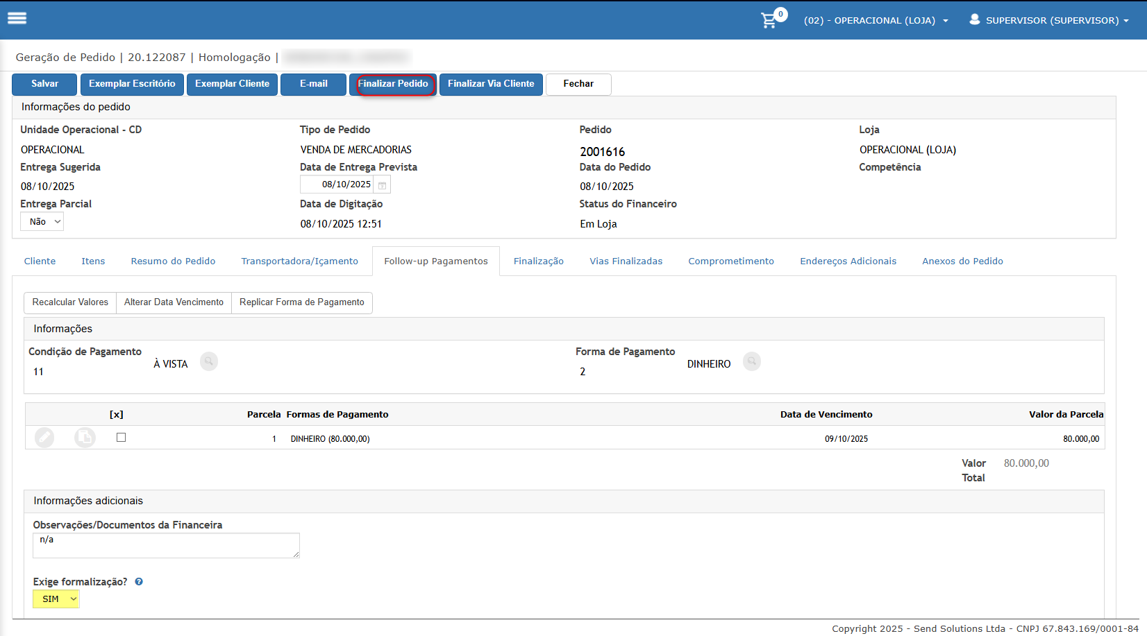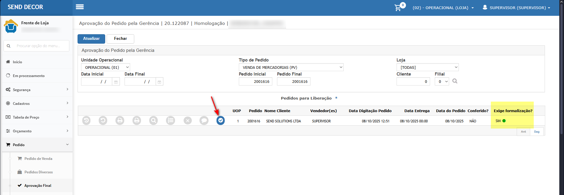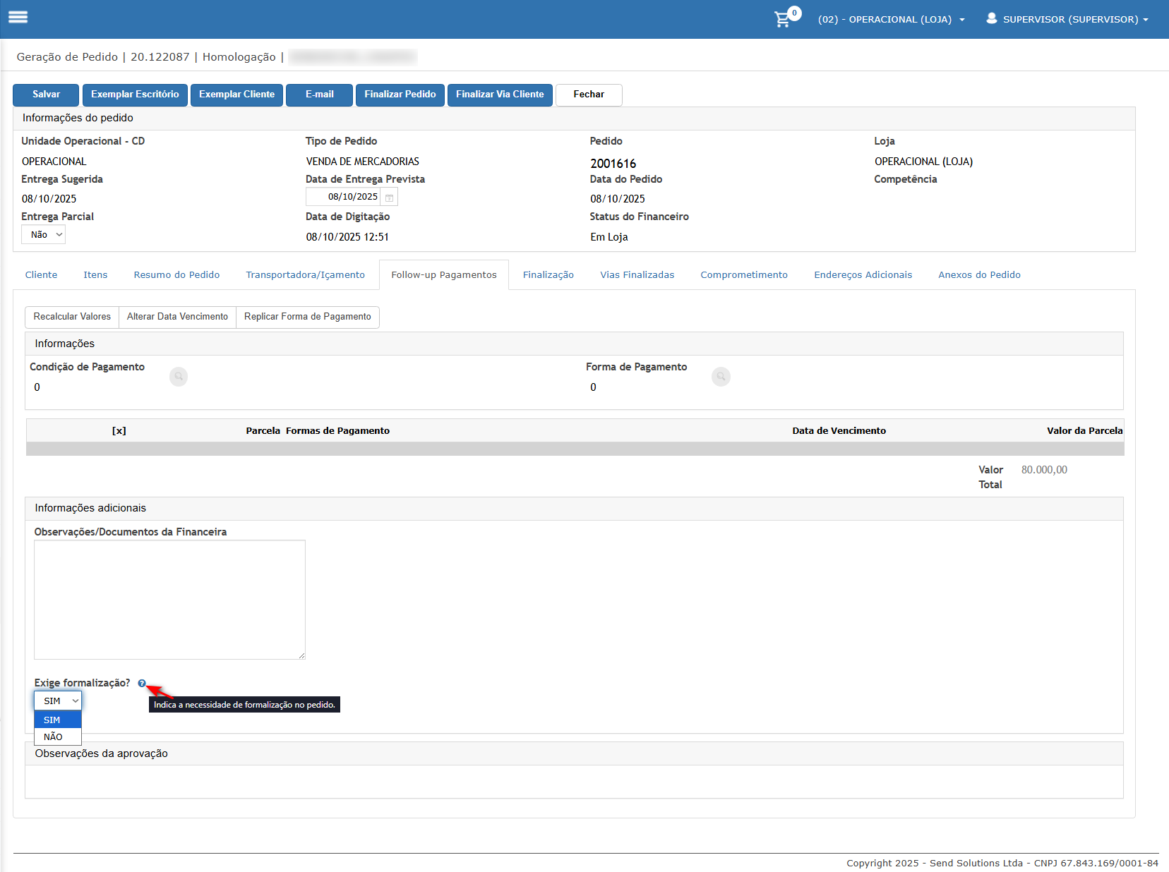 Neste cenário iremos gerar um pedido que exige a formalização, campo apenas informativo para o departamento comercial.