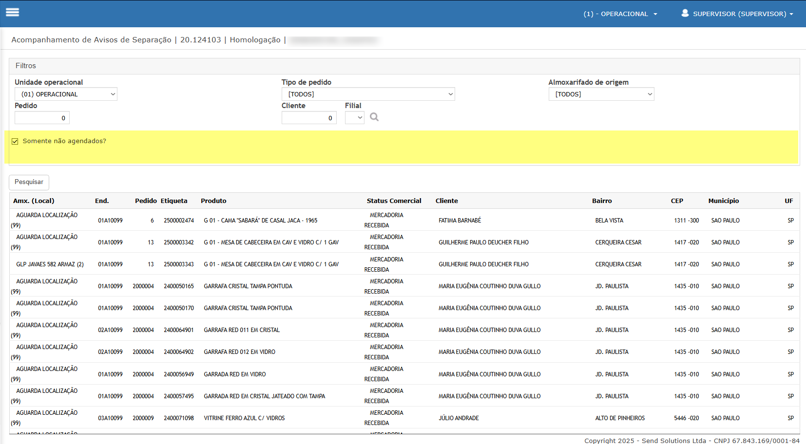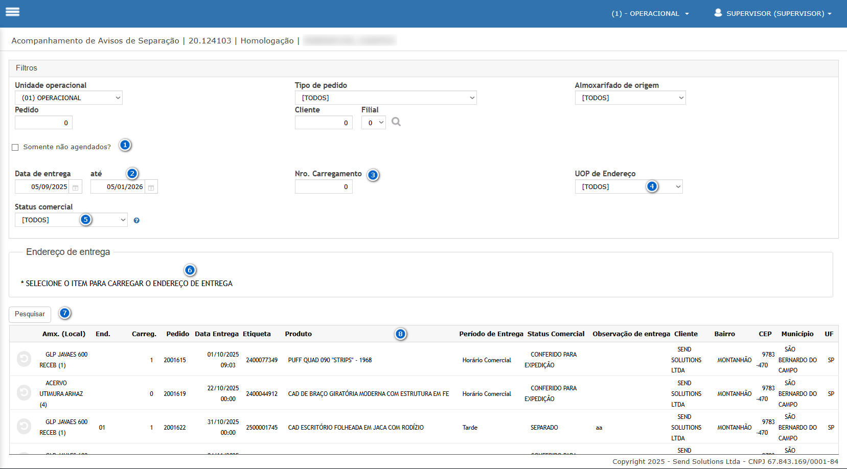6- Campo endereço de entrega, exibe quando o "Somente não agendados" estiver desmarcado;